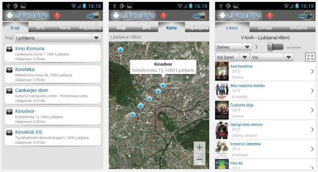 - iskanje kinodvoran po krajih, zemljevidu ali preko GPS lokacije