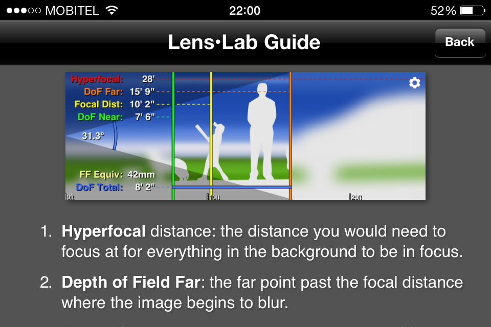 Lens lab je virtualni simulator poljubnih optičnih nastavitev leč in objektivov. Aplikacija na lep in razumljiv grafični način prikaže korelacijo med globinsko ostrino in vidnim poljem za SLR fotoaparate. Profesionalni fotografi boste znali ceniti kako hitro in enostavno pridete do vrednosti za globinsko ostrino. Na svoj račun pa boste prišli tudi laiki in manj napredni uporabniki, ki vam bo v pomoč nekaj prednastavljenih pozicij leč za vajo. Na voljo pa je tudi podroben vodič po aplikaciji z razlago pojmov.