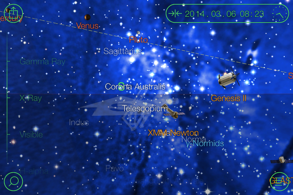 Časovni trak na desni strani zaslona vam omogoča prevrteti čas naprej/nazaj. Tako lahko npr. preverite, kakšno bo zvezdno nebo čez 1 leto.