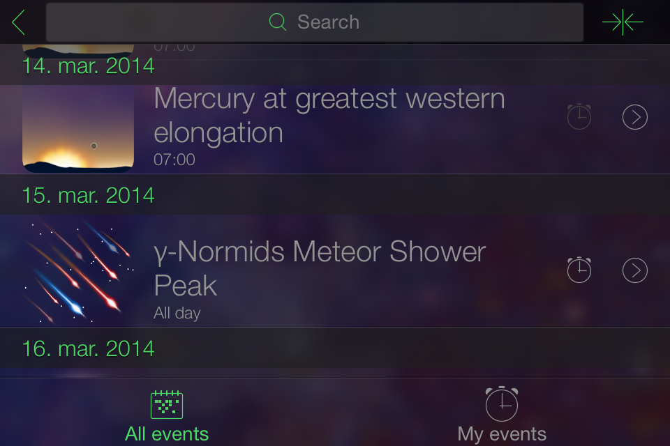 - Vgrajen koledar, ki vas opomni na prihajajoče vesoljne dogodke