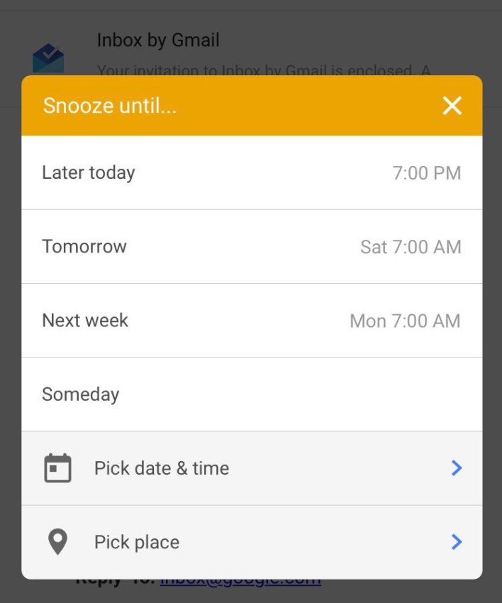 Kdor veliko uporablja e-pošto se zaveda, da le-ta dandanes že temelji na ti. task managementu, kjer je potrebno na nekatera sporočila odgovoriti takoj, za druga pa si lahko in moramo vzeti več časa. Na tem principu je osnovan Inbox, ki recimo omogoča tudi “utišanje sporočil” (snooze funkcija bolj znana pri sodobnih budilkah), kar bo izbrano sporočilo skrilo za določen čas potem pa se bo to spet pojavilo.