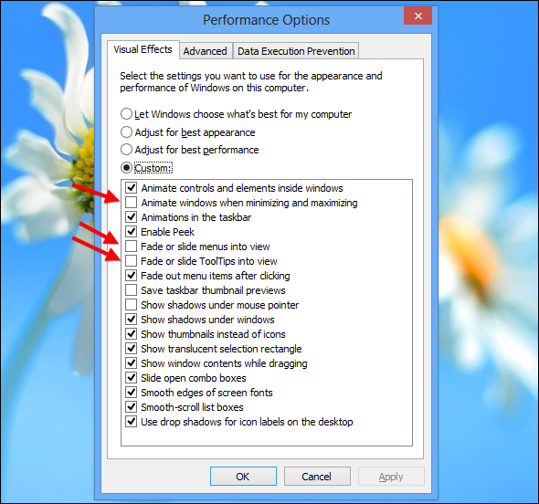 Windows 8 so z vizualnimi bonbončki precej bogat operacijski sistem in seveda, ti zgolj kozmetični dodatki, kot so predvsem senčenje in animacije, lahko zelo obremenijo vaš sistem. Če imate težave s tekočim poganjanjem operacijskega sistema vam najprej priporočam, da se poigrate s temi nastavitvami.