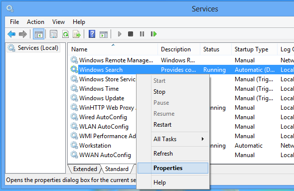 Indeksiranje lahko izklopite tako da v okno, ki ga odprete s kombinacijo tipk “Win + R” vpišete “services.msc” in pritisnete “Enter”. V oknu ki se odpre najdite proces z imenom Windows Search, nanj desno kliknite in izberite “Properties”. Izberite “Disabled” v oknu Startup box in kliknite "STOP" ter pritisnite "OK".