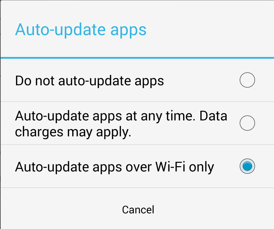 4. Če imate izbrano "auto update apps at any time" (neprestano avtomatsko posodabljanje aplikacij) izberite "Do not auto update apps" (ne posodabljaj aplikacij) ali "auto update apps over Wi-Fi" (avtomatsko posodabljanje aplikacij preko Wi-FI)