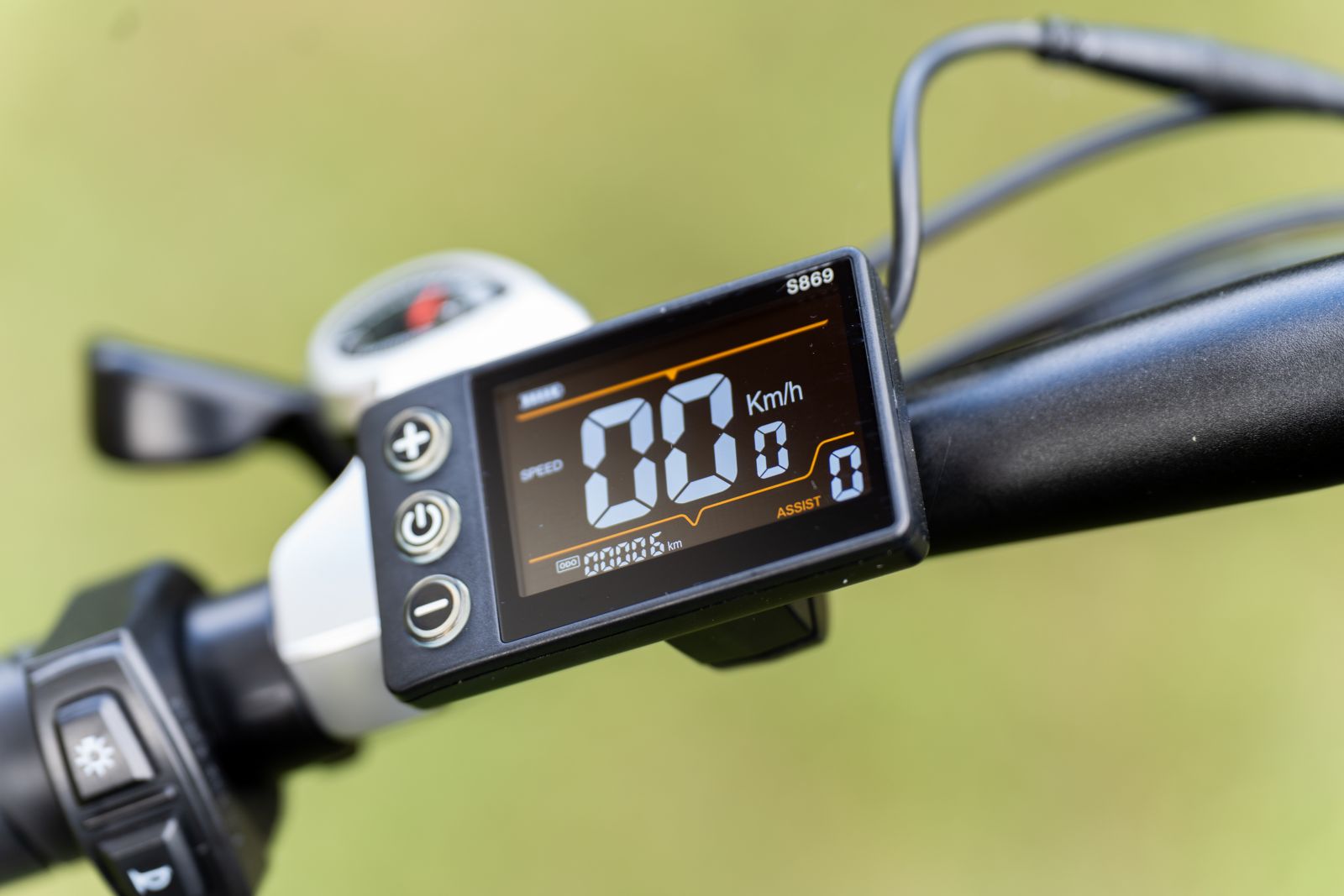 Preko slednjega lahko spremljamo pomembne parametre vožnje in stanja kolesa. Levo od zaslona najdemo tri velike tipke, nameščene ena nad drugo, sredinska za vklop/izklop/funkcija ter spodnja Plus in spodnja Minus tipka preko katerih upravljamo z vsemi nastavitvami ekolesa.V povsem zgornjem delu (levo) imamo grafični prikaz stanja baterije v sklopih prikaza 5/5. Največji, sredinski del zaslona zavzema prikaz hitrosti , spodnji del zaslona pa drži informacije levo in desno. Na levi strani spremljamo prevoženo pot, na desni spodnji strani pa način vožnje od 0 do 5.