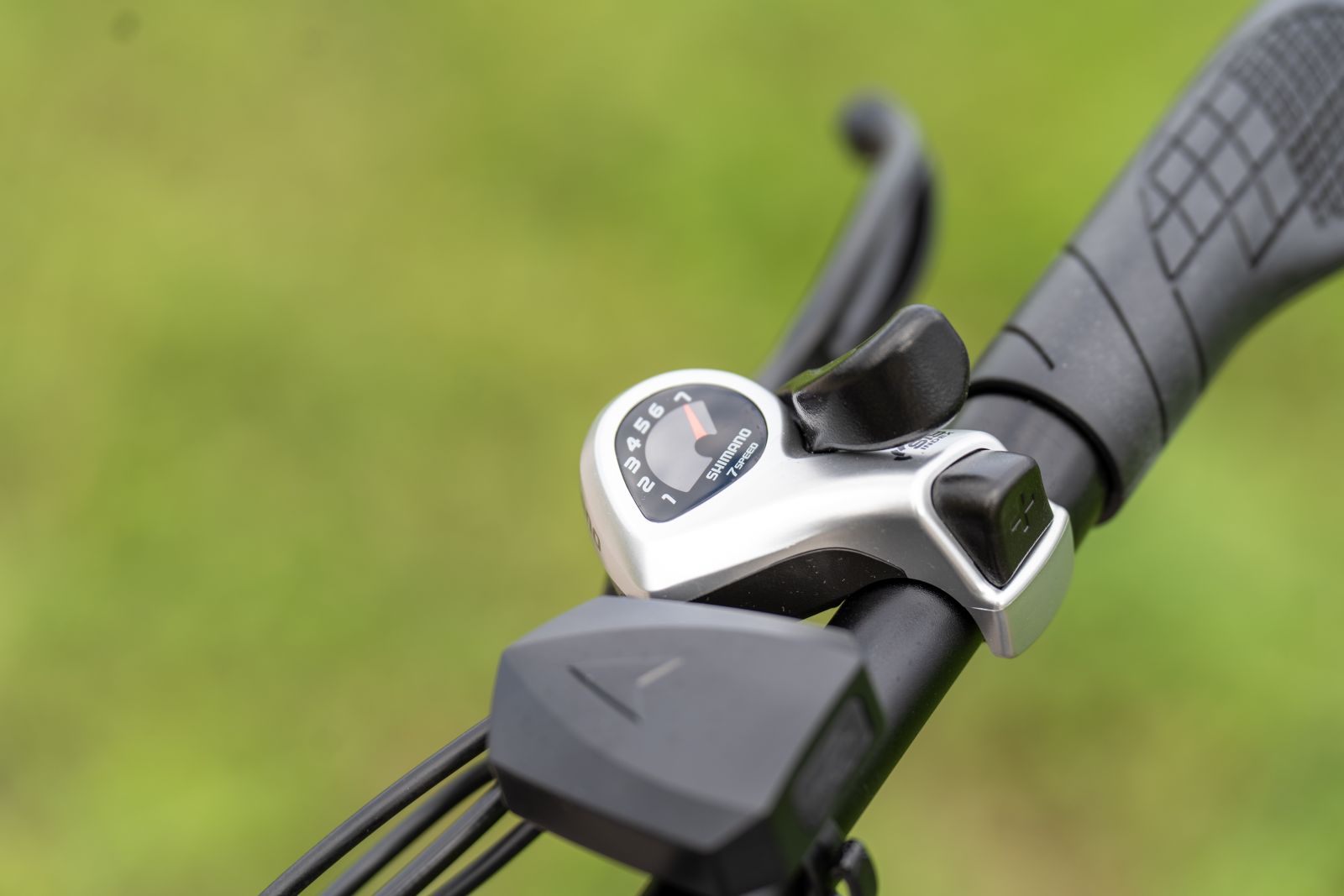 Med njima je nameščen Shimano mehanizem za prestavljanje prednje verige. Sprednji zobniki so trije, zato je nekoliko nenavadno, da na prikazovalniku prestav vidimo znaka "+" in "-", namesto številk 1, 2 in 3, kar je posledica že omenjenega “brez-kliknega” prestavljanja,na kar lahko gledamo kot na pozitivno ali negativno stvar.. Zavore na testnem kolesu so mehanske disk zavore, zavorne ročice pa so precej osnovne. Na desni strani krmila se nahaja mehanizem za prestavljanje zadnje kolesne verige, kjer pa so prestave že označene s številkami. Za razliko od leve strani, kjer se prestavlja z eno ročico, se na desni strani prestavlja z ročico in gumbom. Ročica za prestavljanje hitrosti deluje na principu vrtenja in zavzame malo več kot tretjino prostora, kjer držimo roko.