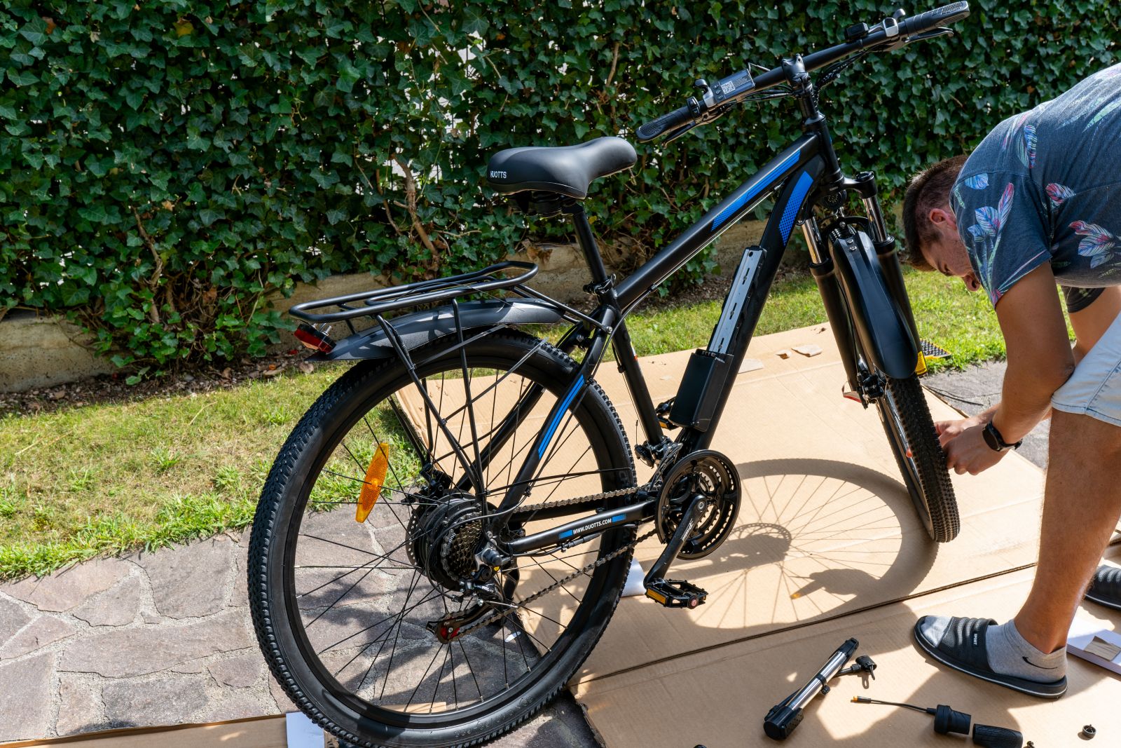 Kot že omenjeno ekolo Duotts C29 prispe delno sestavljen, namestiti je potrebno sprednje kolo, sedež, zategniti pedale, namestiti luči, (prtljažnik in blatnike po želji) in seveda krmilo. Priložena sta tudi tlačilka in večnamensko orodje, ki sta se izkazala za zelo uporabna in povsem zadostna. Vsi kabli so že napeljani, kakšnega je potrebno le “vtakniti” skupaj. Na koncu sem nekoliko nastavil še zavore, prestave pa so bile potrebne več ljubezni, zato sem se oglasil še na kolesarskem centru, kjer so jih majstri v 10min za 10€ lepo nastavili, saj kolo iz škatle ni prestavljalo najlepše, preverili in fino nastavili so še zavore (včasih je po transportu koles potrebno še malo naravnati diske). Slednje priporočam vsakemu, ki se ne spozna najbolje na fine nastavitve kolesa, saj je razlika delovanja kolesa kot dan in noč.