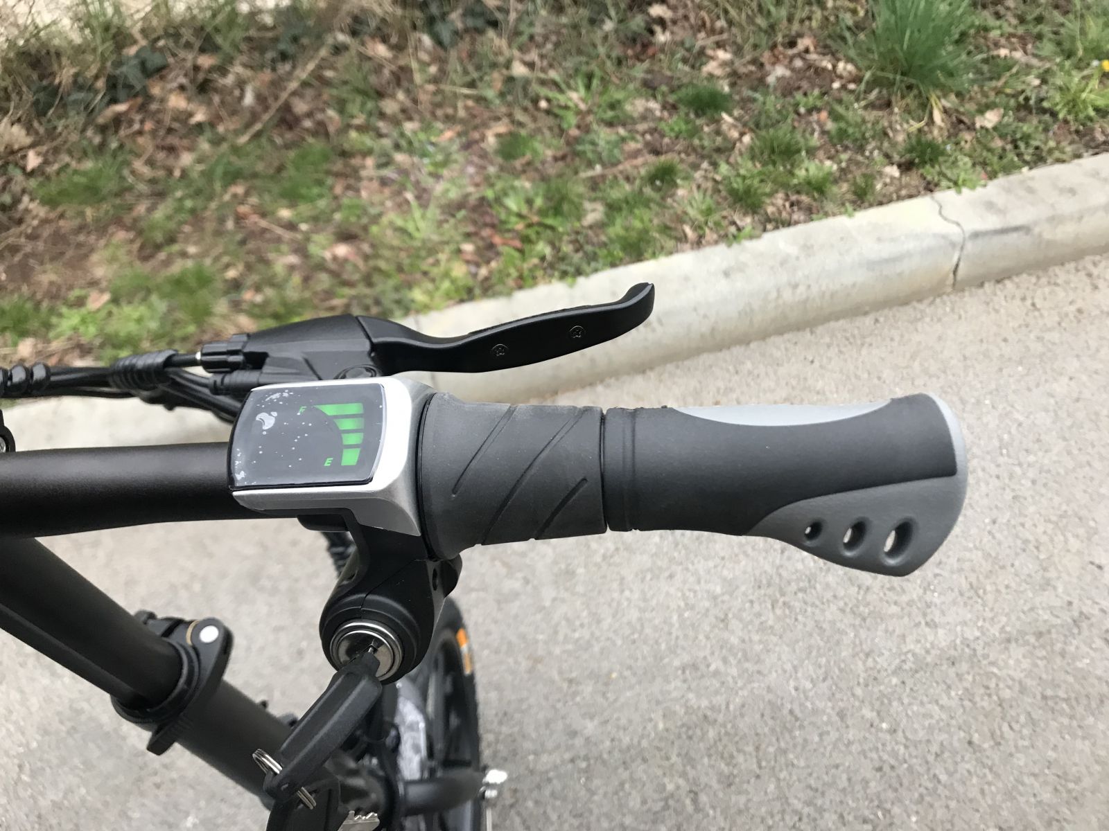 LCD ekran, ob pogledu na katerega smo sprva mislili, da morda prikazuje hitrost in druge pomembne podatke o e-kolesu in vožnji, žal prikazuje le nivo baterije. Ob tem pa se vsebina na njem ob močni sončni svetlobi slabše vidi. Upali smo, da namesto tega obstaja kakšna aplikacija, ki bi jo bilo mogoče povezati z e-kolesom, a omenjeno ni na voljo.