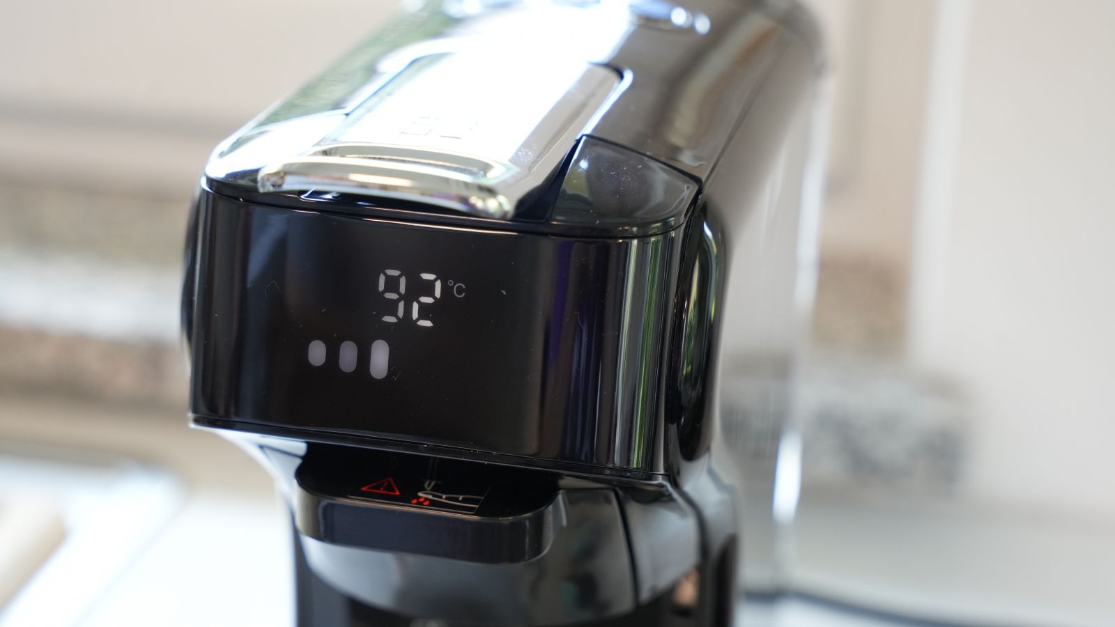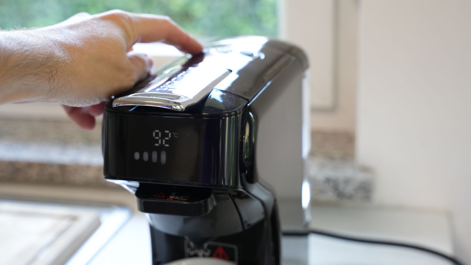 Zaslon in gumbi delujejo intuitivno, kar je v praksi zelo pomembno. Ni zapletenih menijev; s pritiski na gumba večnamenskega gumba za volumen/zagon ter "+" in "-" hitro prilagajamo volumen, za menjavo med pripravo med vročo/hladno kavo pa je postopek sledeč: ko prižgemo napravo bo predgrelec segrel sistem na 92°C.