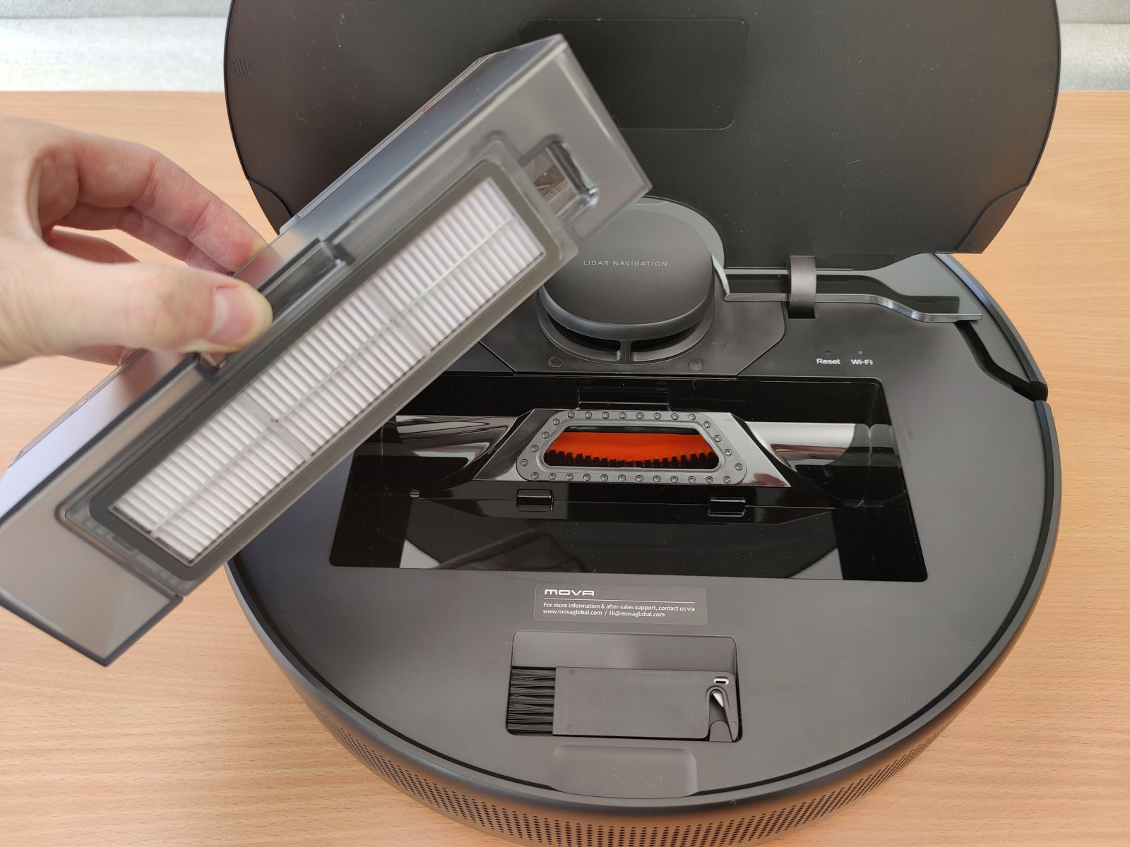 Sicer pa Mova L600 s klasično izboklino na vrhu, kjer domuje LDS (laserski) senzor (radar), poleg še minimalistično vgrajena dva fizična gumba (za zagon in tipko domov), na zadnji strani najdemo prezračevalni sistem, spredaj in na strani majhne odprtine za senzorje, na spodnji strani pa nekaj senzorjev, rotacijska krtačja, stranska metlica, kontakti za polnjenje, klik sistem za posodico in krpico ter seveda velika kolesa, ki zmorejo premagovanje preprek do 2cm. Pod pokrovom najdemo košek za smeti s HEPA filtrom ter nožek za odstranjevanje las in daljših dlak iz rotacijske krtačke.