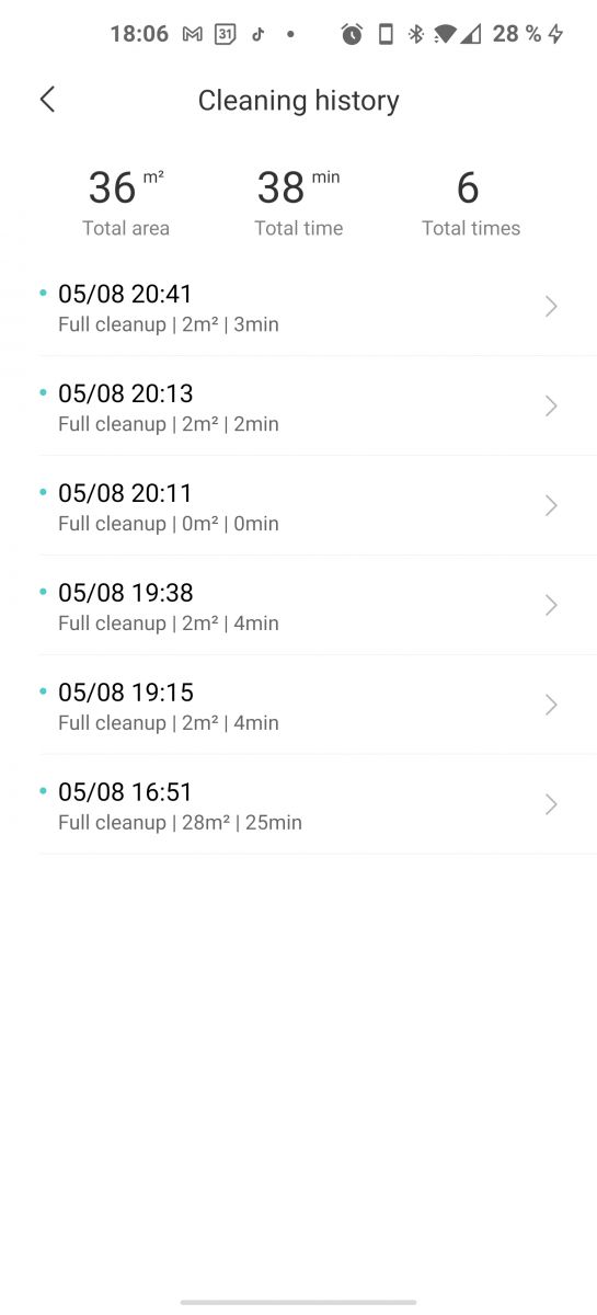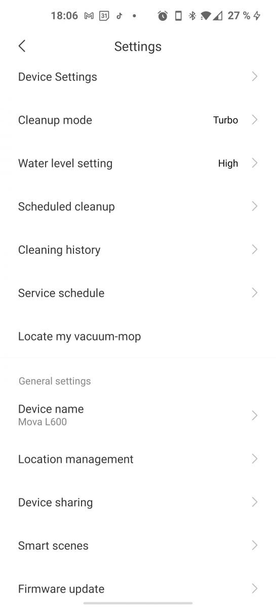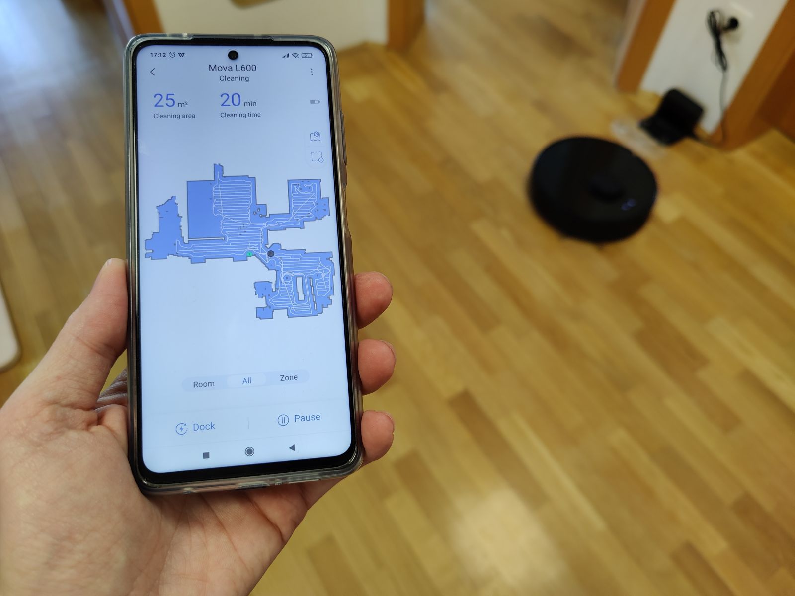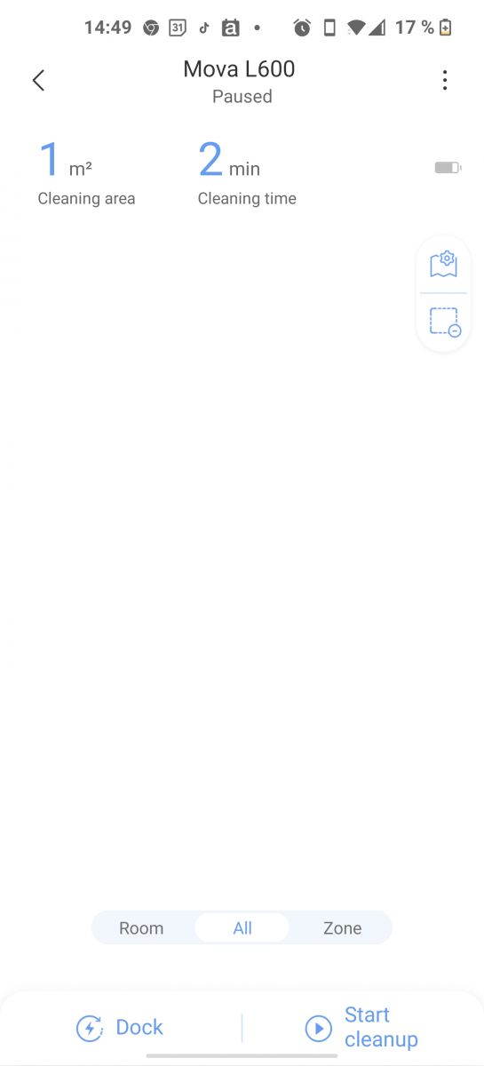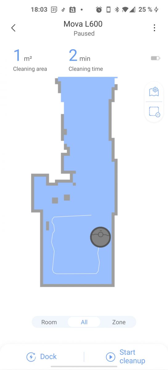 Za razliko od nekaterih Xiaomio modelov, kjer imamo pri zagonu opcijo suhega, mokrega ali kombiniranega čiščenja, pa pri Mova L600 nič ne izbiramo, sesalnik zaženemo tudi iz aplikacije zgolj z enim ukazom, potem pa sesalnik sam zazna ali imamo nameščeno posodico za vodo in krpico ali ne in glede na to zažene suho oz. kombinirano čiščenje.
