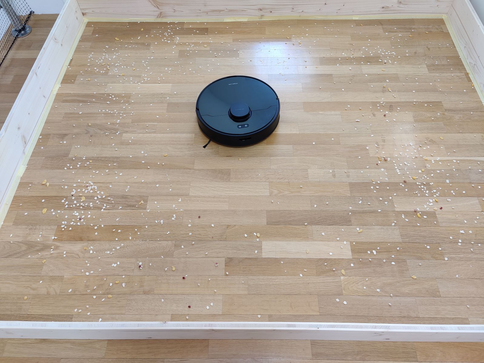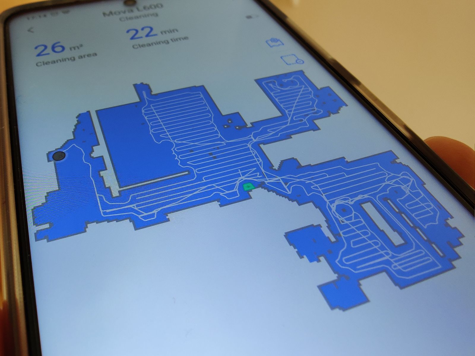 Pri tem je na omenjeno vplival ključni dejavnik, saj se Mova L600 po zaključenem čiščenju ograjenih 3m2 še ni zaustavila ampak se je odločila še za en obhod in tako pravzaprav tla počistila 2x. Slednje se sicer ne zgodi, ko pošljemo sesalnik na čiščenje po sobi ali stanovanju a v tem primeru se je vsakič odločila za dvojno čiščenje. Podobno sicer lahko ročno nastavimo na določenih modelih, t.i. dvojno čiščenje, a Mova je tako delovala popolnoma samostojno in tako doseglja zavidljiv rezultat. Podobno funkcijo sicer vidimo na novemu a dražjemu modelu Roborock S7, ki če tako nastavimo, tla očisti v mreži, najprej po eni diagonali in nato še po drugi. Kakorkoli pa vzamemo, dejstvo je, da je Mova samodejno dosegla izjemno visok odstotek učinkovitosti čiščenja pod ekstremnimi pogoji, res pa je, da je za to potrebovala tudi občutno več časa.