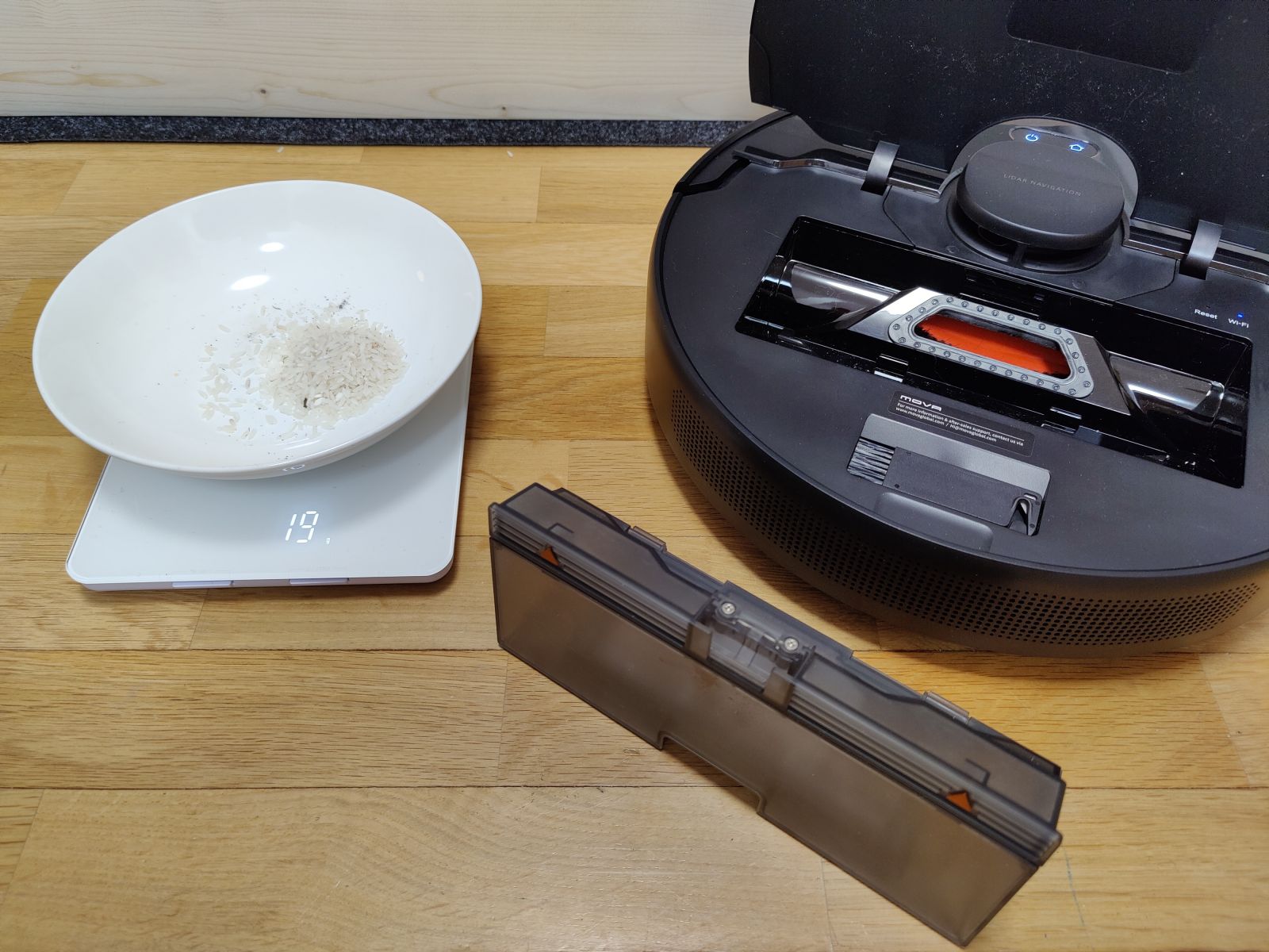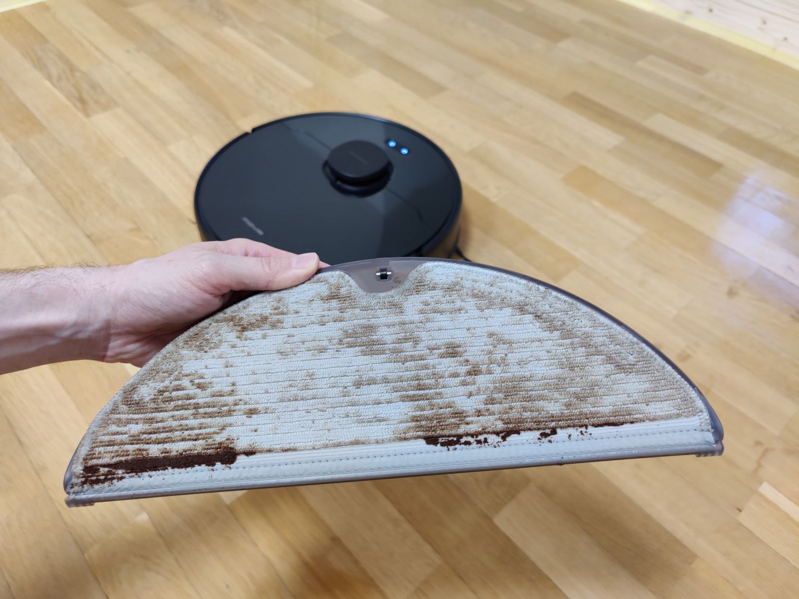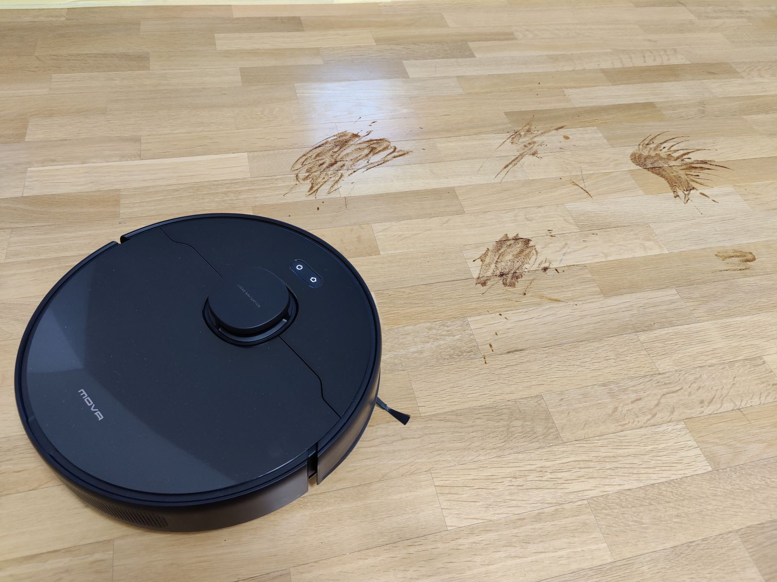 Robotski sesalnik Mova L600 smo preizkusili še s testom mokrega čiščenja na gladki površini, kjer smo na tla nanesli močnejšo mešanico kave in počakali 10min, da se madeži delno posušijo. Tudi na tem področju nas je Mova presenetila, saj je s tal počistila skoraj vso umazanijo, malenkostno poznalo se je le proti koncu, ko je bila že krpica zelo umazana od kavnih usedlin, tako smo ob vsem čiščenju opazili res le rahel majhen pas, kjer zaradi umazane krpice učinkovitost več ni bila 100%, a očesu komaj vidno, na videu se praktično ne vidi, kar pa bo sicer težava prav vseh modelov robotskih sesalnikov. Jasno, še bolj trdovratnejši in bolj zasušeni madeži bi bili večji zalogaj, a pri testu mokrega čiščenja izhajamo iz še realnih situacij, saj se hudih razlitij in izjemno trdovratnih madežev z robotskim sesalnikom ne bomo lotili. Še eno področje torej, kjer smo bili pozitivno presenečeni.