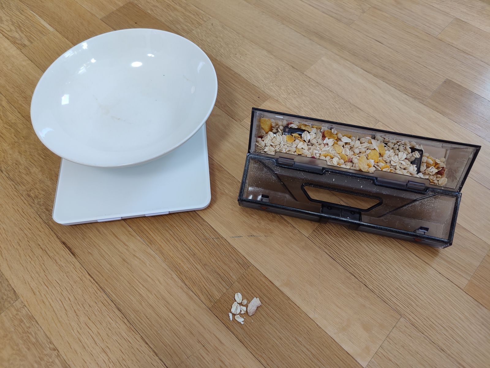 Za omenjeni test uporabimo Musli z različnimi dodatki, zrnic različnih mer in teže ter obvezno z 30% manj maščob in brez sladkorja! (ok, just kidding, any Musli would do ofcourse) 30g naključno izbranih zrnic potresemo po ročno izdelanem poligonu, okvirju iz lesa (da je test enakovreden za vse modele), test pa je izveden tako na gladki podlagi (parket, lakiran) ter na gosto tkani, nizki preprogi, kjer je musli zamenjal riž, tokrat 20g.