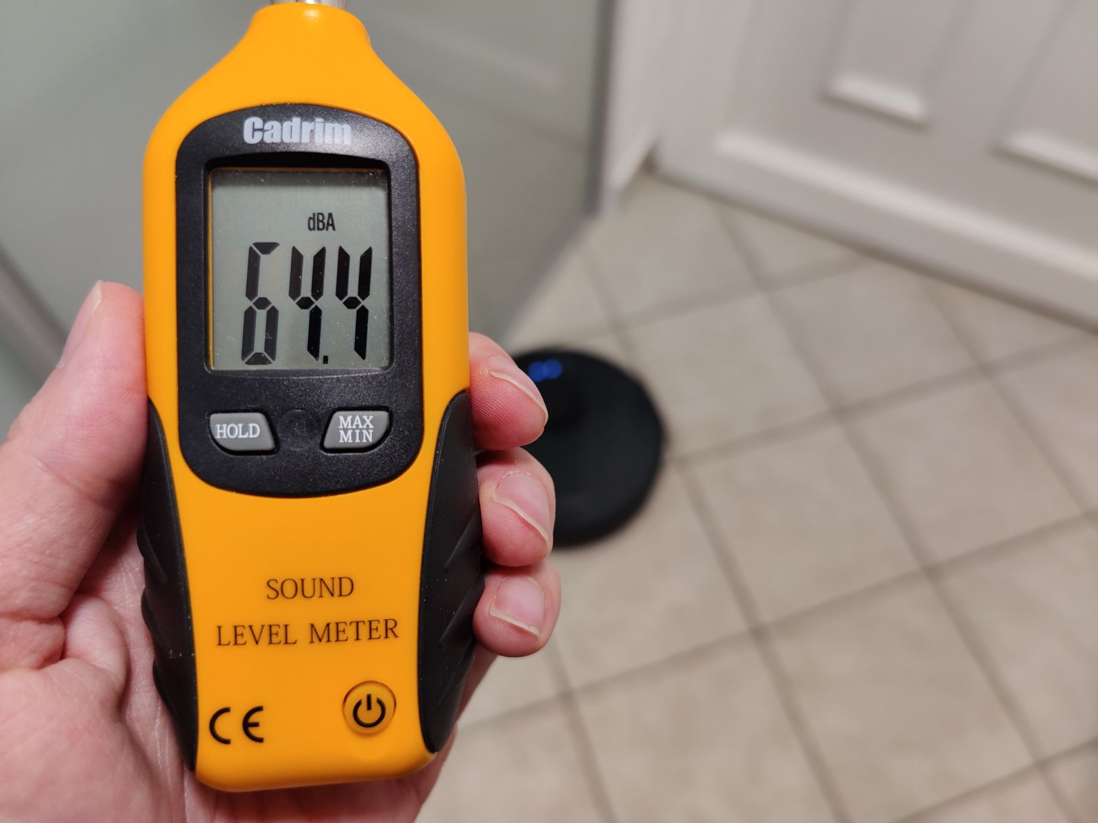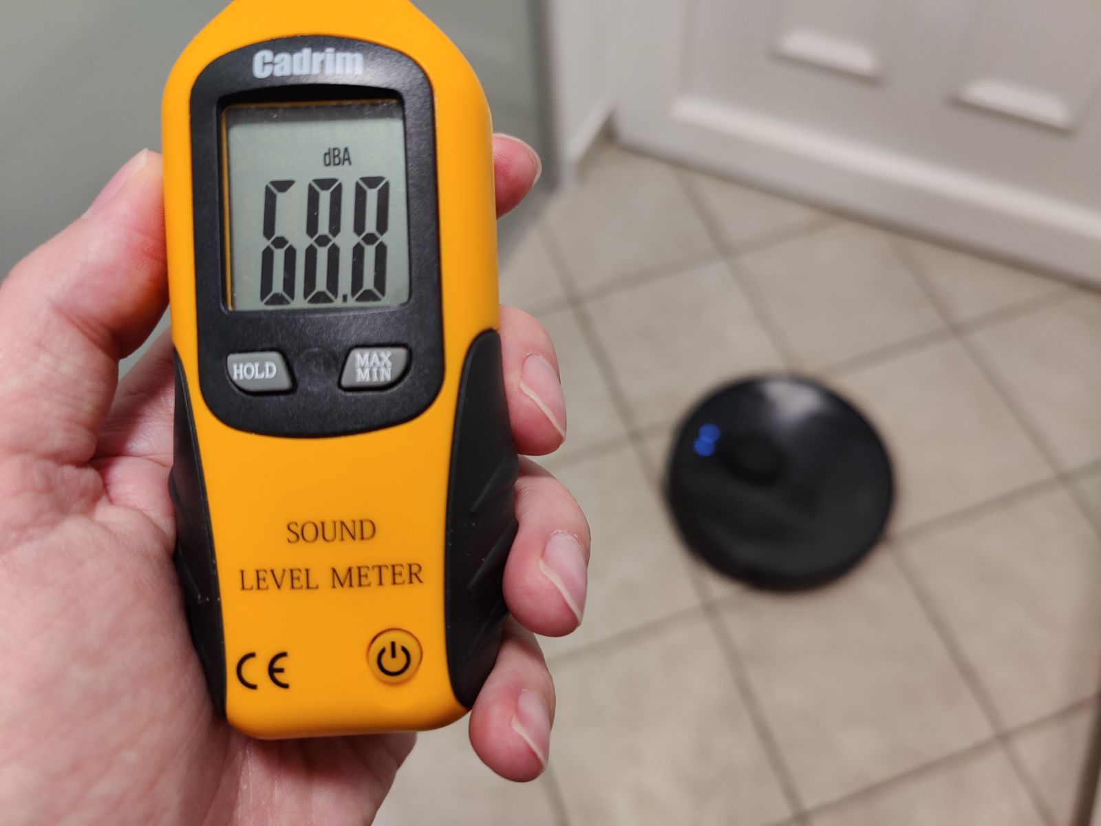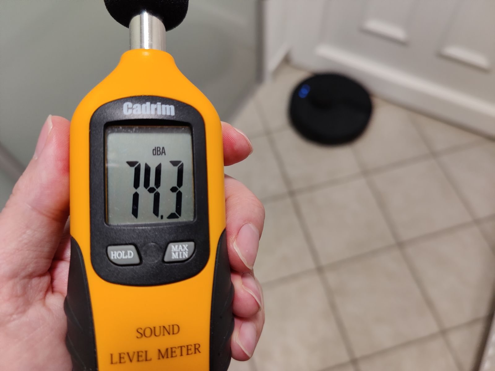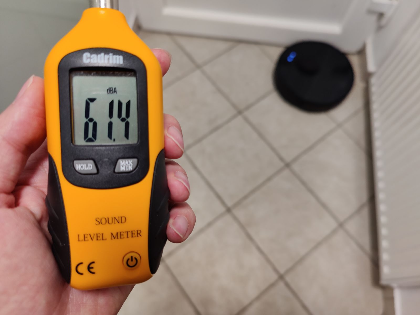 Da preverimo kako moteča je Mova L600 pri delovanju smo slednje izmerili še z merilnikom glasnosti in sicer na razdalji 1m ter tako zabeležili glasnost delovanja na neravnih, reliefnih ploščicah, kjer že samo gibanje sesalnika lahko doda nekaj dB ter tako zabeležili max vrednosti, ki jih lahko pričakujete pri delovanju na različnih stopnjah sesalne moči. Rezultati so sledeči: