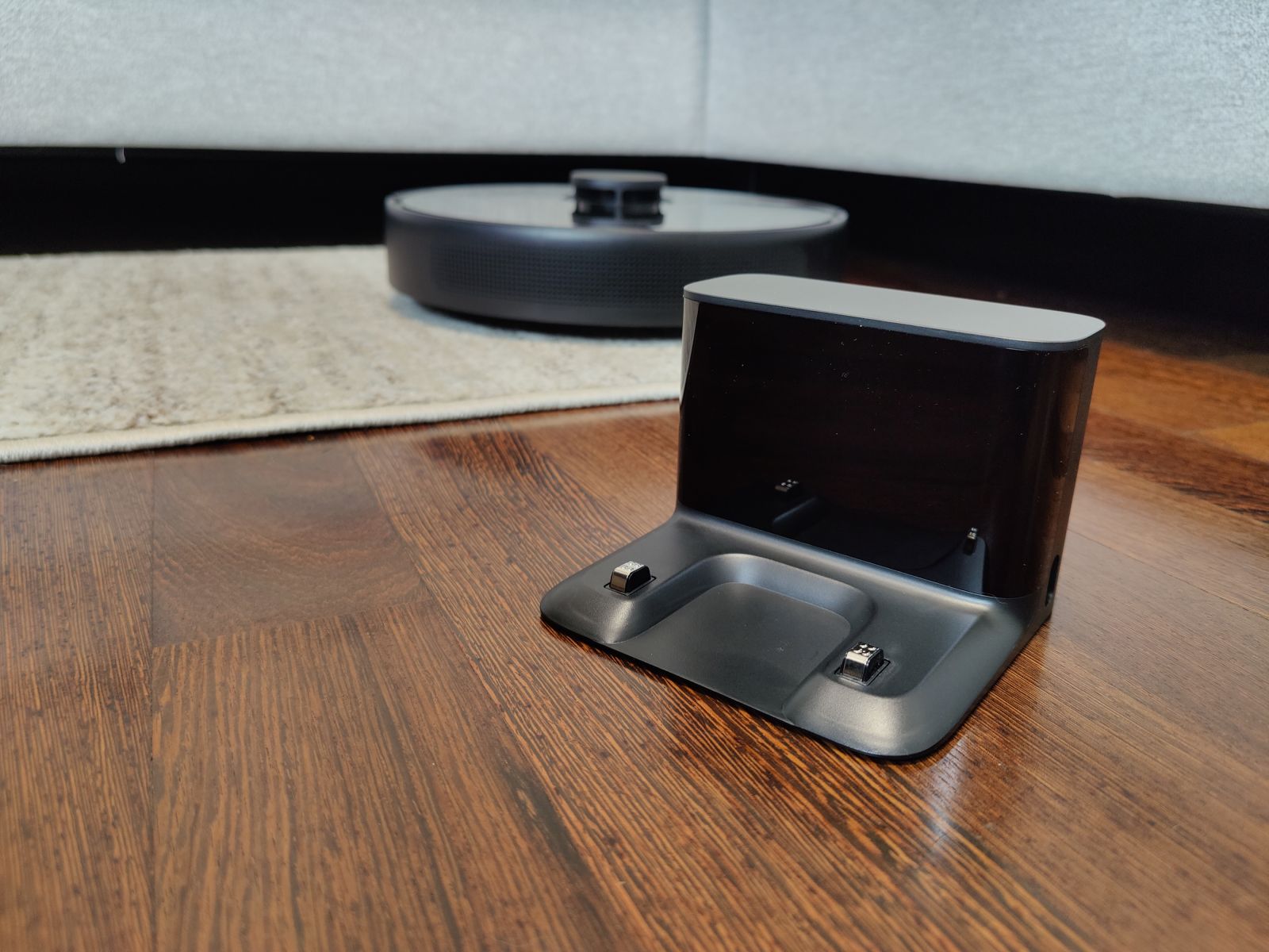 Za razliko od nekaterih novejših modelov robotskih sesalnikov, ki vključujejo tudi samočistilno polnilno postajo (ki je za nekatere bolj, druge manj praktična), je pri modelu Mova L600 priložena klasična polnilna postaja. Zopet podoben dizajn kot pri ostalih Xiaomi modelih, postaja je kompaktnih mer, kar bo marsikoga razveselilo, sesalnik pa se polni preko kontaktov nameščenih na spodnji strani.