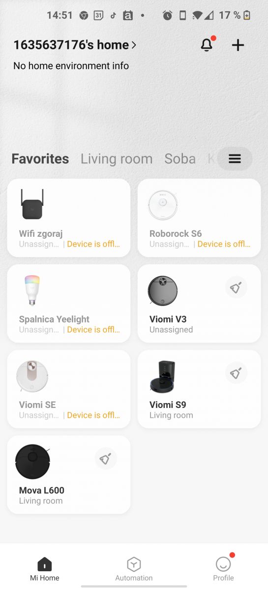 V Google Play ali Apple Store poiščemo aplikacijo Xiaomi Mi Home ter jo namestimo, se registriramo in vpišemo, izberemo regija Slovenija. V aplikaciji bomo desno od naše ID številke zasledili znak + s pritiskom na katerega bomo dodali novo napravo. Sprehodimo se navzdol do robotskih sesalnikov in izberemo model Mova L600, kliknemo nanj, nato pa sledimo navodilom v aplikaciji, ki narekuje, da na sesalniku pritisnemo oba gumba hkrati in s tem zaženemo povezovanje s aplikacijo preko domačega WiFi omrežja. Ko prično lučke na sesalniku utripati v aplikaciji potrdimo delovanje, počakamo da aplikacija najde in prepozna sesalnik in nam ponudi spisek WiFi povezav, med katerimi izberemo našo WiFi omrežje, preko katerega imamo povezan že telefon, vpišemo geslo. Označimo kvadratek, da se strinjamo s pogoji in počakamo, da se aplikacija in sesalnik uspešno povežeta, kar nam aplikacija prikazuje v štirih korakih. Če je vse ok, se bo sesalnik s tem povezal z aplikacijo in naše čiščenje se lahko prične.