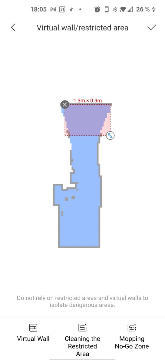 nad izrisano mapo in pod stanjem baterije, zgoraj desno imamo dve ikoni, prvi okvirčem z minus znakom je Virtual Wall / Restricted Area, kjer določamo:
