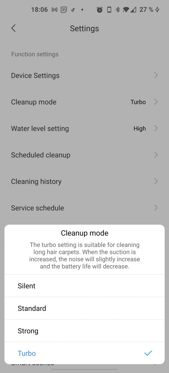 - Cleanup mode (sesalna moč: Silent / Standard / Strong / Turbo)