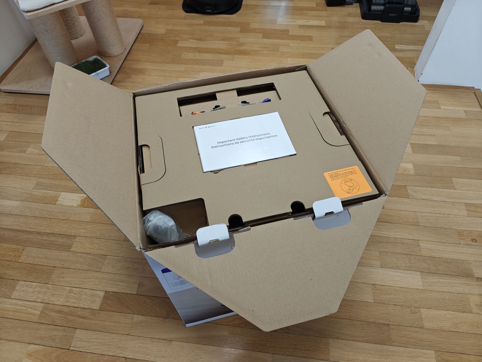 Izjemno všečna, barvno privlačna in dizajnirana embalaža že pri prvem stiku navduši in pritegne uporabnika. Narwal na področju priložene opreme ne sklepa kompromisov. V primerjavi s konkurenco je razlika v tem pogledu hitro opazna. V kompletu nas pričaka celovit nabor pripomočkov, vključno z robotskim sesalnikom Freo Z10 Ultra, samočistilno bazo, sprednjim zaščitnim plastičnim dodatkom za polnilno postajo, EU napajalnikom, osnovnimi navodili ter parom stranskih metlic, ki jih uporabnik enostavno namesti sam. Priložena je tudi 500-mililitrska plastenka detergenta, ki se ob uporabi samodejno dozira.