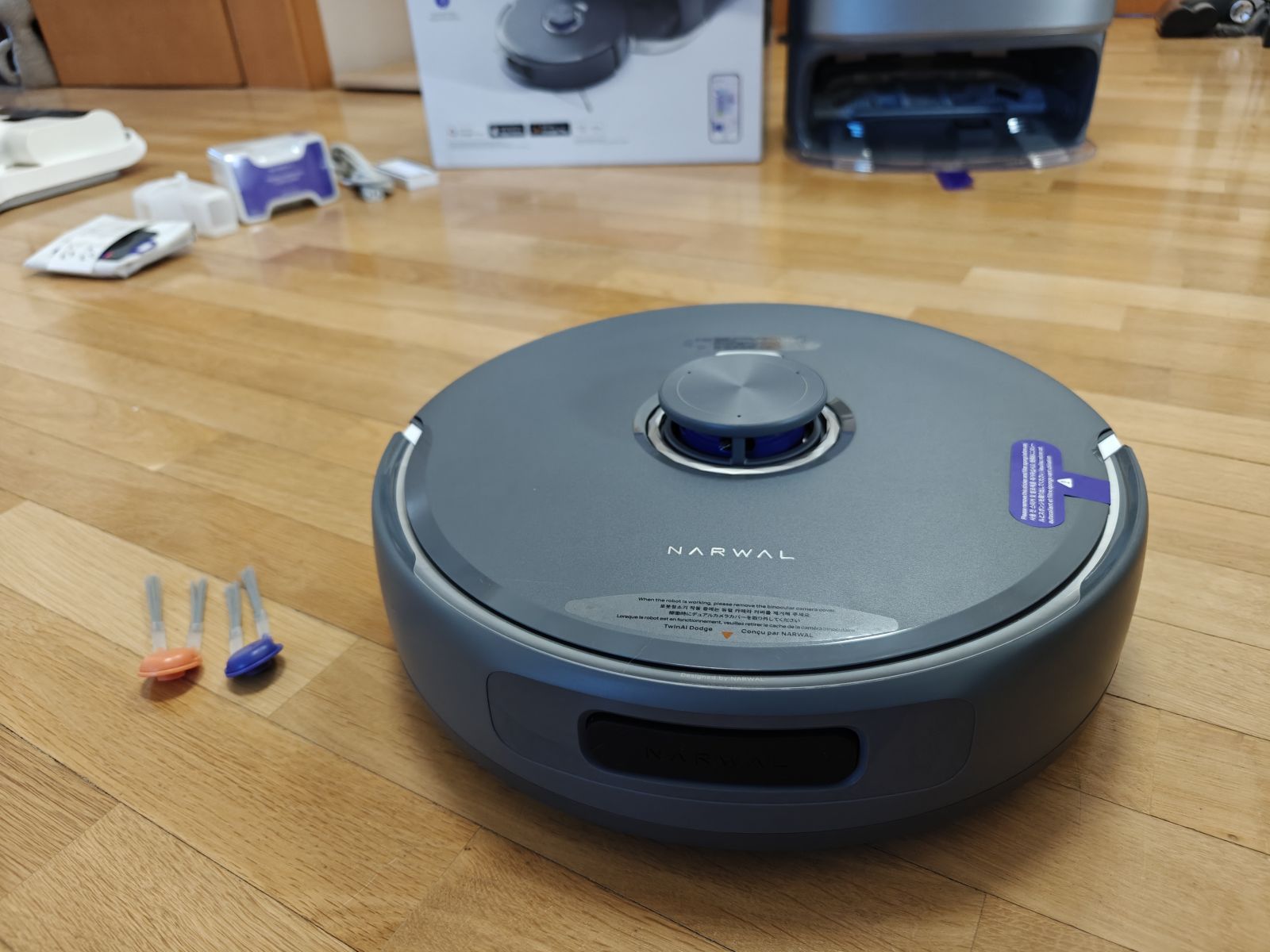 Če pogledamo še spodnji del robotskega sesalnika, se zasnova bistveno ne razlikuje od znanih Narwalovih rešitev. Dve stranski metlici (ki sta tokrat zasnovani dinamično) pomagata pomesti umazanijo proti sredini, kjer je nameščena glavna krtača, obdana s sesalno odprtino. Krpa za mokro čiščenje je razdeljena na dva rotacijska diska (v osnovi okrogle a s povdarkom na triangularni obliki za še višjo učinkovitost čiščenja), kar omogoča enakomerno čiščenje tal.