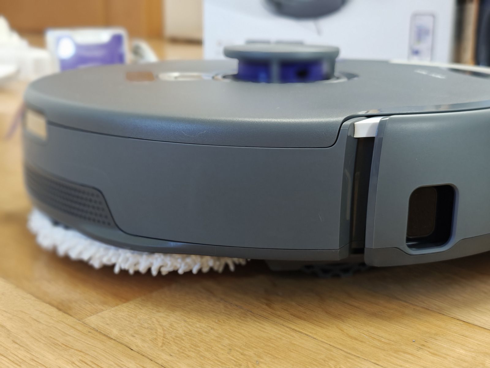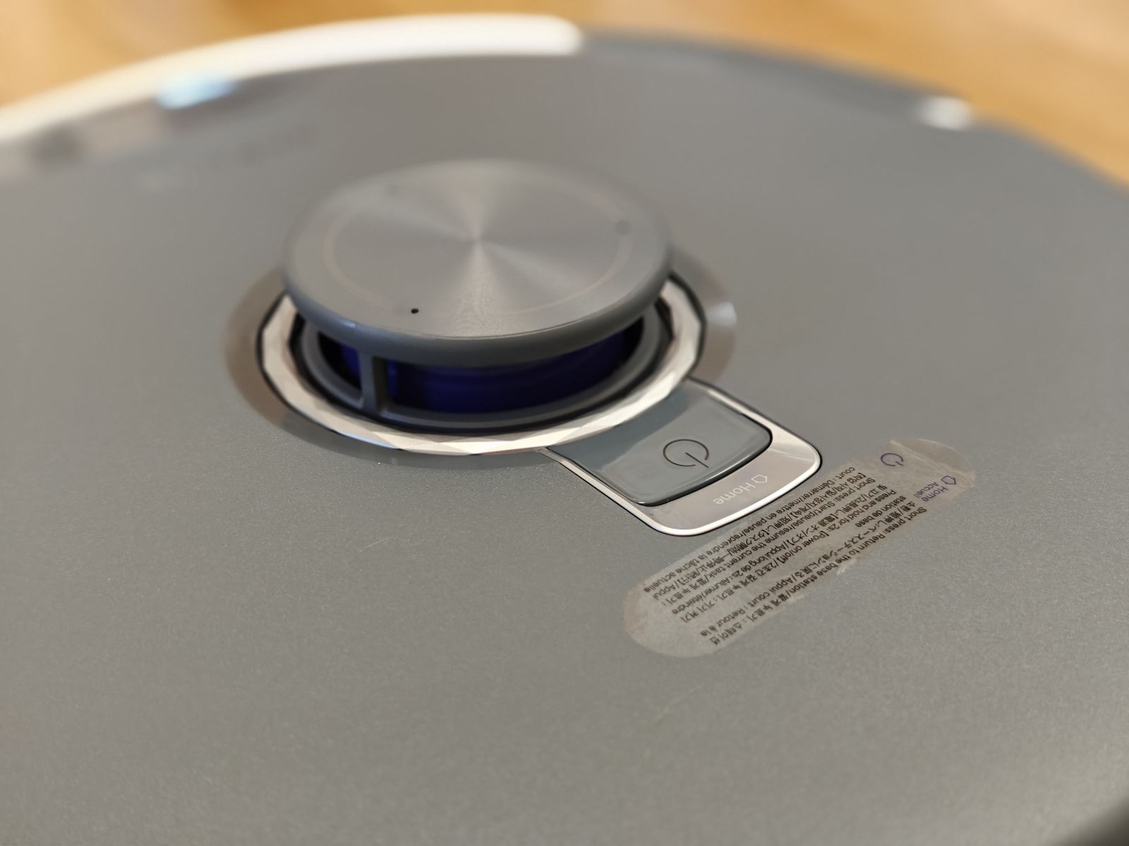 Zgornja stran sesalnika skriva navigacijski sistem LiDAR, nameščen v manjši okrogli izboklini. Ob njem sta še dva fizična gumba – eden za vklop in izklop, drugi za samodejno vrnitev naprave v polnilno postajo. Pokrov na vrhu, ki je magnetno pritrjen (kar se je izkazalo za kar praktično rešitev že v predhodnih modelih), omogoča dostop do notranjosti sesalnika, kjer se nahaja posoda za prah.