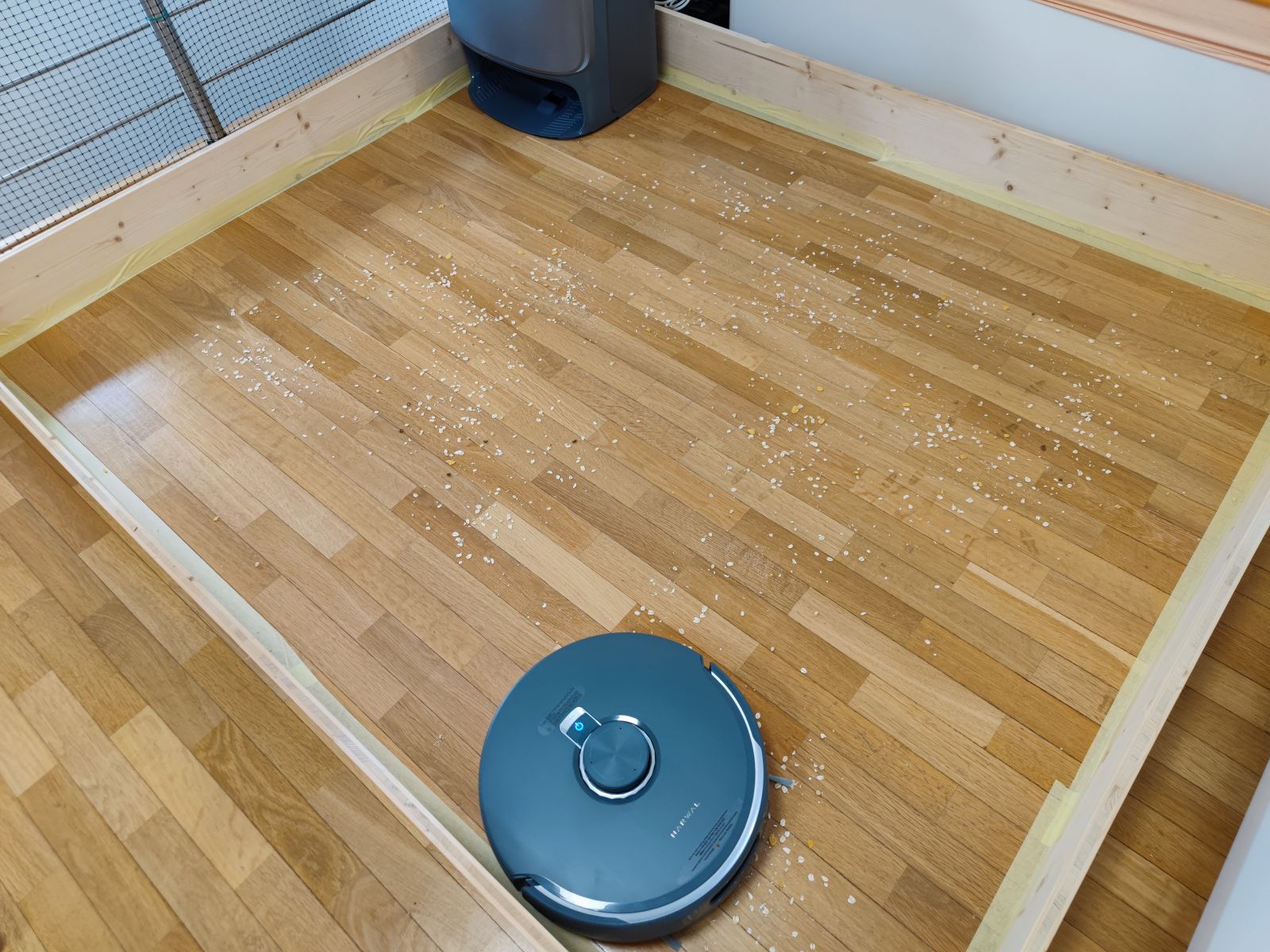 Za oceno zmogljivosti pri mokrem čiščenju smo tudi tokrat pripravili izziv, ki presega običajne pogoje čiščenja tal. Po tleh smo razmazali gosto pasto iz moke in vode – zmes, ki se po sušenju spremeni v trdovratno, skoraj lepljivo plast. Da bi test še otežili, smo madež pustili sušiti kar nekaj časa, posledično se ustvari zasušeni sloj, ki ga je težko odstraniti tudi ročno. Čeprav robotski sesalniki niso namenjeni prav tovrstnemu tipu čiščenja – za to obstajajo tudi nekoliko bolj namenski in specializirani aparati za mokro čiščenje – je prav tak preizkus idealen za odkrivanje razlik v realnih zmogljivostih med modeli.