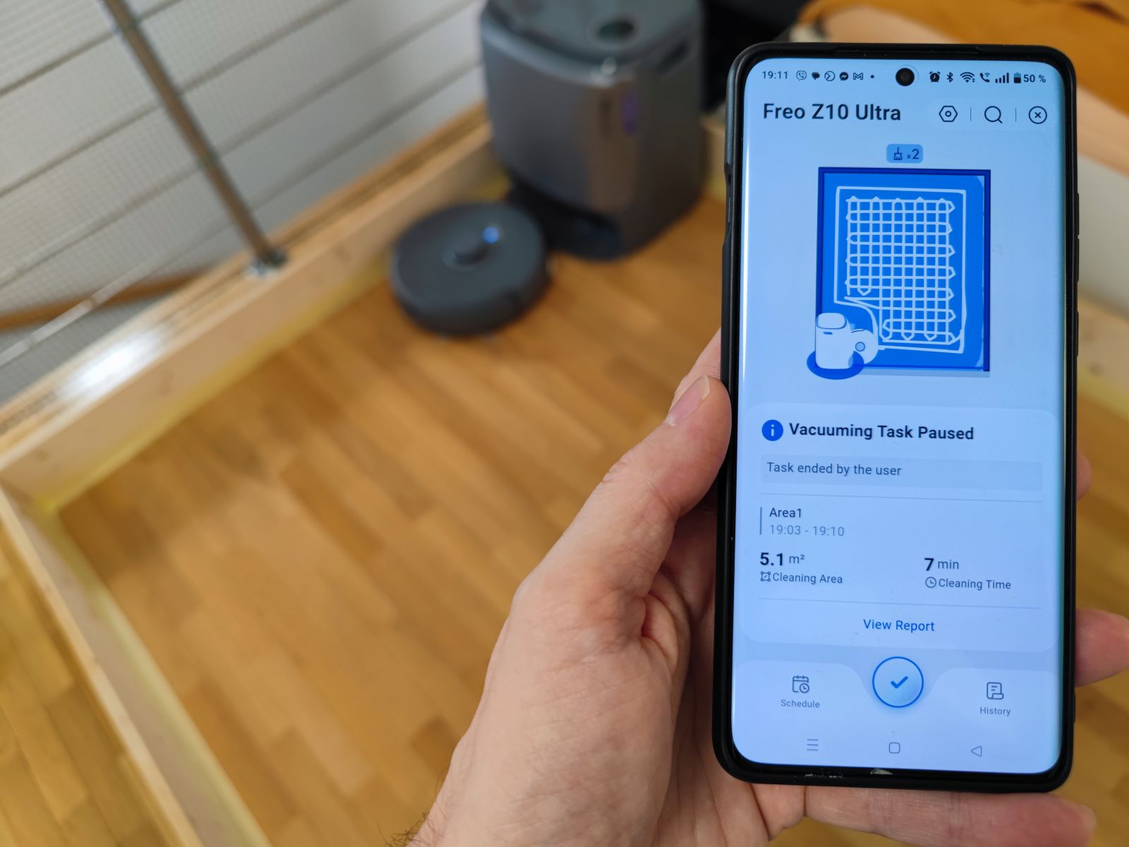 Že po prvem prehodu sesalnika je bilo jasno, da kombinacija toplote, vlage in rotacije deluje na Freo Z10 Ultra deluje še nekoliko bolje kot pri lanskem modelu – madeži so se še bolj omehčali in že po prvem prehodu vido delno izginili (bolj kot pri lanskem Z Ultra modelu). Drugi prehod je dodatno izboljšal rezultat, saj je iz tal izginil večji del ostankov. Tretje čiščenje je odstranilo skoraj celoten madež, a zopet z izjemo nekaj manjših točk, ki jih niti z ročno navlaženo krpo nismo uspeli odstraniti brez res intenzivnega drgnjenja 30s. In če opravila na hitro ne zmore roka z viledo, od robota tega seveda ne moremo pričakovati – vsaj ne brez pomoči posebnih detergentov in še več ponovitev.