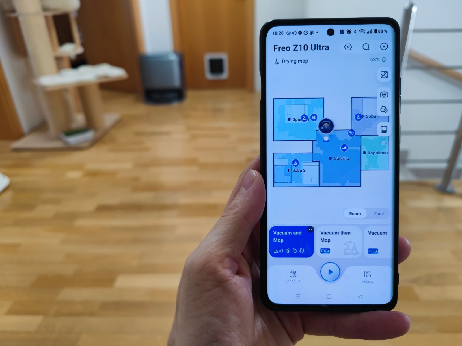 V obdobju testiranja je Narwal Freo Z10 Ultra več dni vestno skrbel za čistočo v naši dvonadstropni hiši, ki meri približno 75 m² na nadstropje (bruto). Stanovanje si delimo trije člani gospodinjstva in dva kosmata sostanovalca – mačka, ki sta poskrbela za dodatne izzive pri čiščenju. Po standardnih dnevnih nalogah smo sesalniku zadali še nekaj konkretno zahtevnejših preizkusov in ga neposredno postavili ob bok enemu trenutno najmočnejših konkurentov na trgu – modelu Roborock S8 MaxV Ultra.