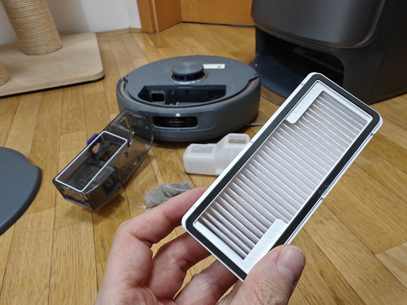 Ena izmed priročnih funkcij, ki jo prinaša Z10 Ultra, je delna avtomatizacija čiščenja filtrov. Samočistilna postaja namreč pri praznjenju smetne posodice uporabi visoko sesalno moč tudi za izpihavanje zbranega prahu iz filtrov, kar bistveno zmanjša potrebo po pogostem ročnem vzdrževanju. Kljub temu pa priporočamo, da uporabniki filter občasno (vsaj enkrat mesečno) očistijo tudi ročno – ker gre za pralni HEPA filter, ga lahko preprosto speremo pod vodo, ki pa kljub navajanju proizvajalcev, da so filtri pralni v praksi ni najboljša rešitev. Po čiščenju je treba poskrbeti, da je filter popolnoma suh – priporočljivo je sušenje vsaj 24 ur pred naslednjo uporabo. Najbolj učinkovita metoda čiščenja filtrov je spihanje ali čiščenje z drugim sesalnikom.