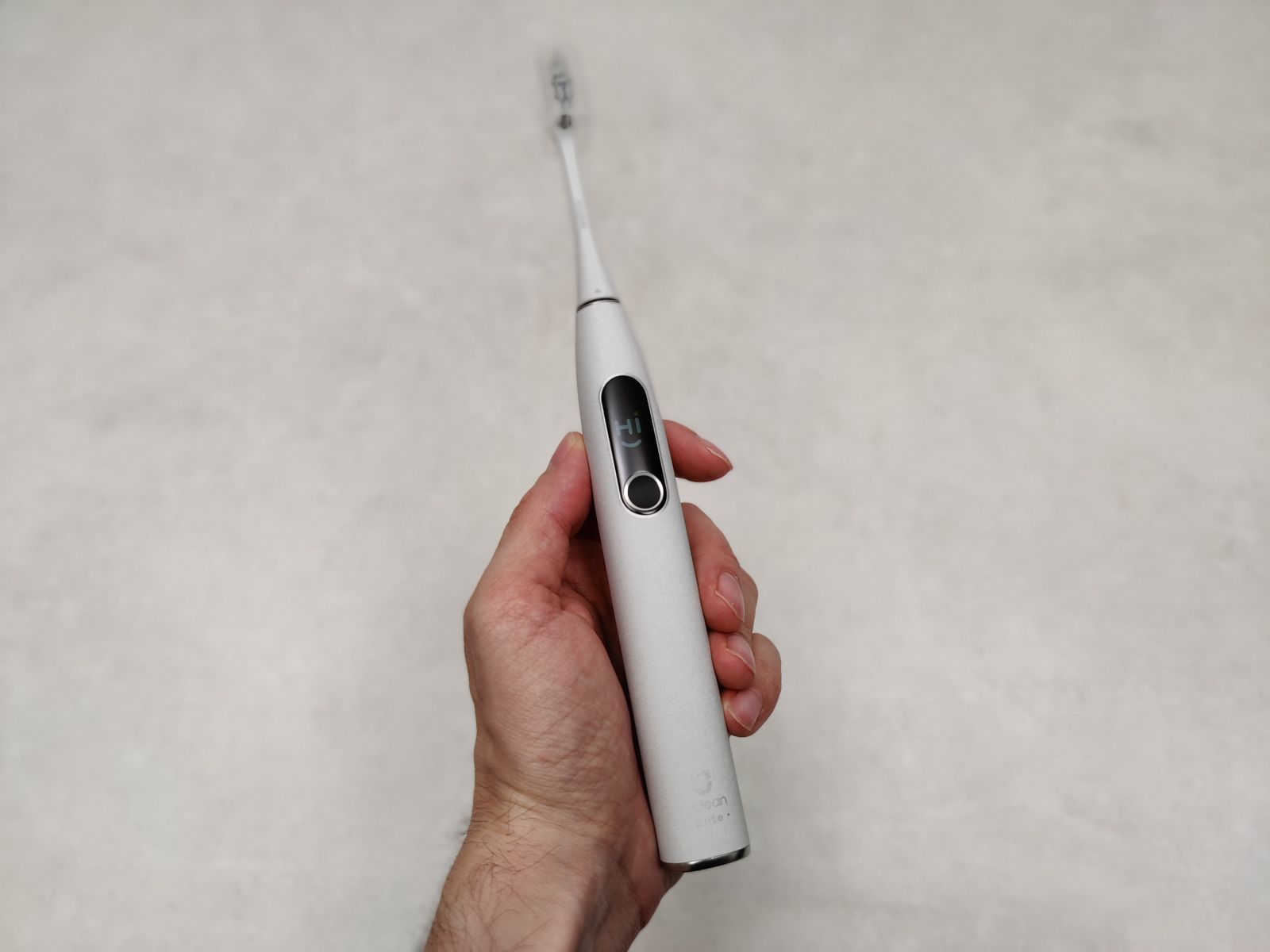 Pa se najprej dotaknimo najbolj zanimive lastnosti Oclean X Pro Elite modela. Na sredini ščetke se namreč nahaja velik, barvni LCD zaslon na dotik, ki pa sicer za določene potrditvene funkcije ponuja odzivnost fizičnega gumba v srebrni obrobi.