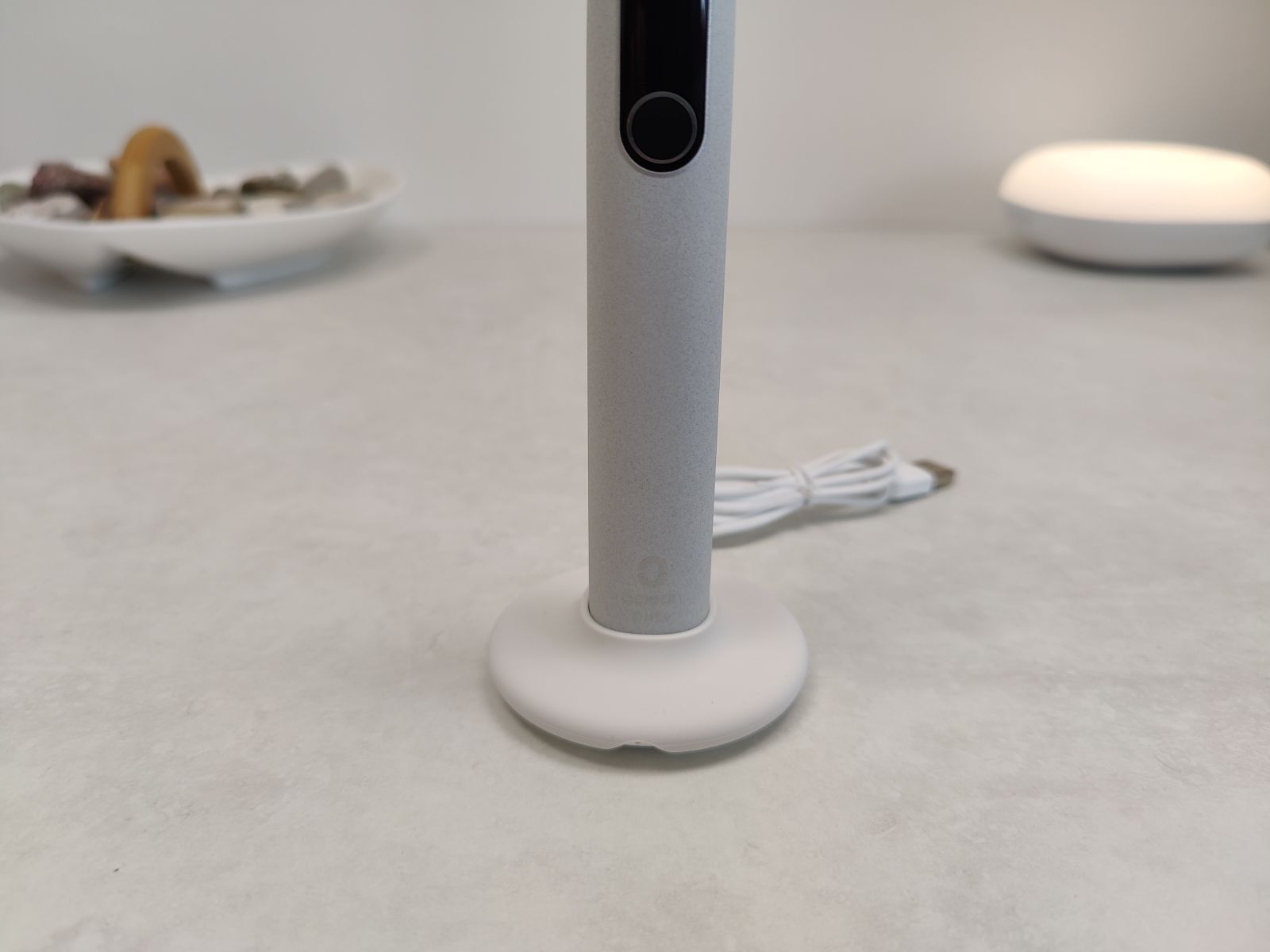 Na spodnji strani se nahaja polnilni mehanizem, ščetka se polni indukcijsko, se pravi brezžično s postavitvijo na priložen polnilec, ki hkrati deluje tudi kot nastavek za shranjevanje, če se ne odločimo za montažo stenskega magnetnega držala.