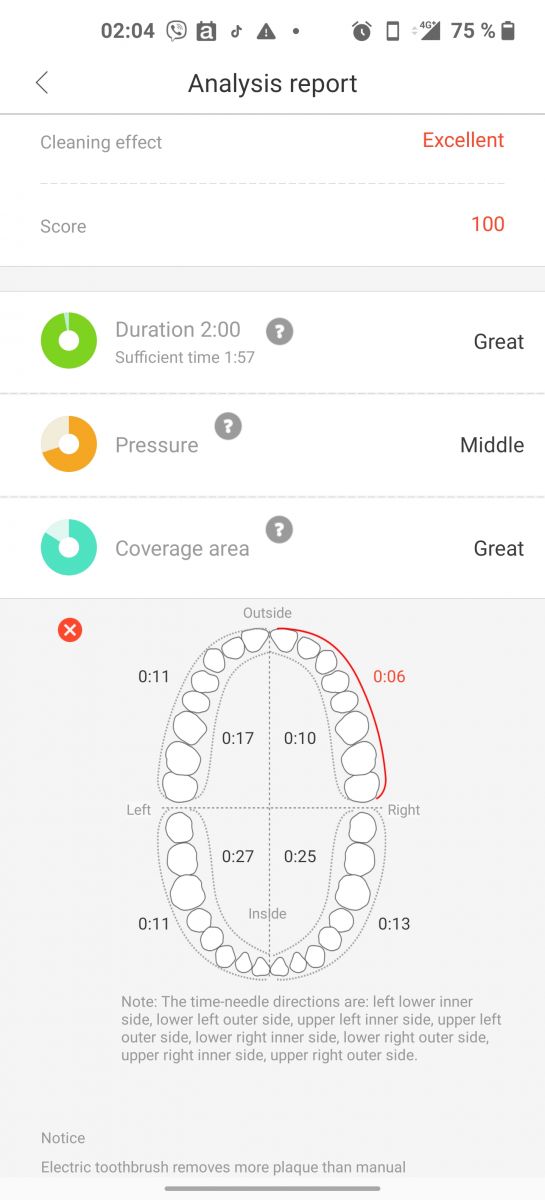 Po zaključki ščetkanja oz. pretečenih 2 minutah bo ščetka prenehala z delovanjem, na zaslonu pa se nam bo pokazala grafična analiza ščetkanja, poleg pa še rezultat, ocena ščetkanja, ki temelji na zaznavanju vgrajenih senzorjev (6-axis gyroscope), kako temeljito in natančno smo čistili zobe, smo kakšen predel izpustili, ni bilo dovolj pritiska itd. Predeli ki so bili dobro očiščeni so obarvani belo, predeli, ki jih nismo dobro očistili pa so obarvani modro ..