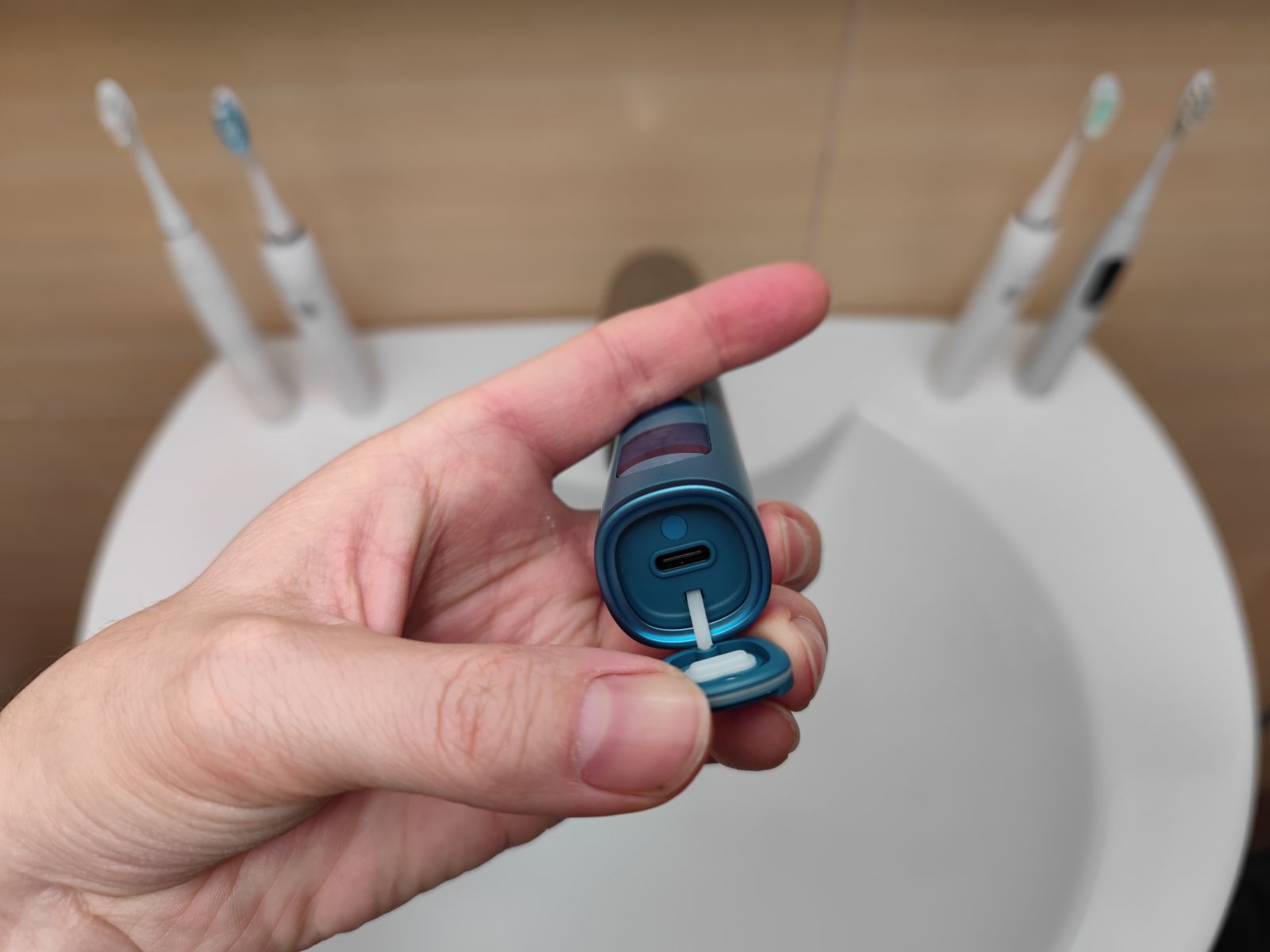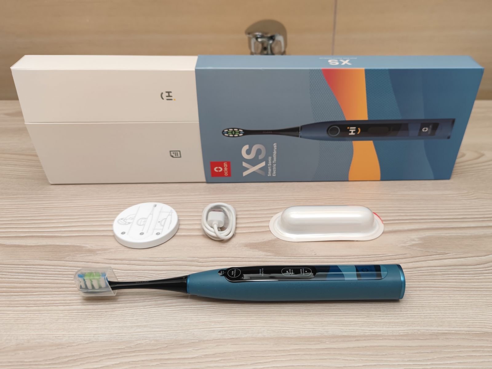 Za razliko od svojih najdražjih predhodnikov se ščetka ne polni brezžično, kar ima svoje pluse in minuse, priložen USB-C kabel je namreč res kratek, dobra novica pa je, da lahko uporabimo katerikoli USB-C kabel. Razlika med žičnim in brezžičnim polnjenjem se skriva tudi v hitrosti polnjenja, Oclean XS se namreč s svojo nadpovprečno baterijo od 0-100% napolni v zgolj 3h.