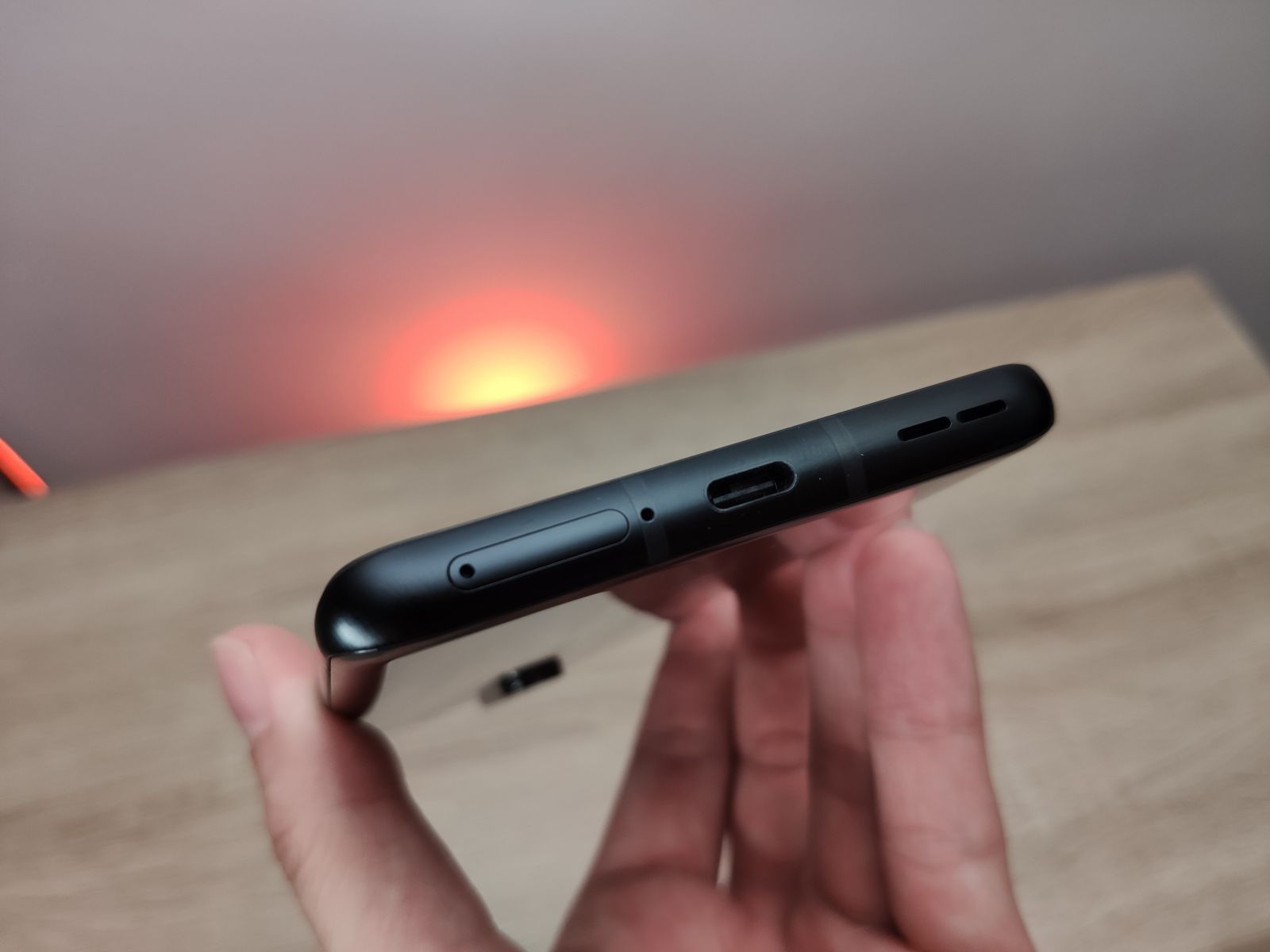 V spodnjem delu telefona najdemo USB-C vhod in precej zanimivo postavljen predalček za SIM kartico v družbi z mikrofonom in enim od stereo zvočnikom.