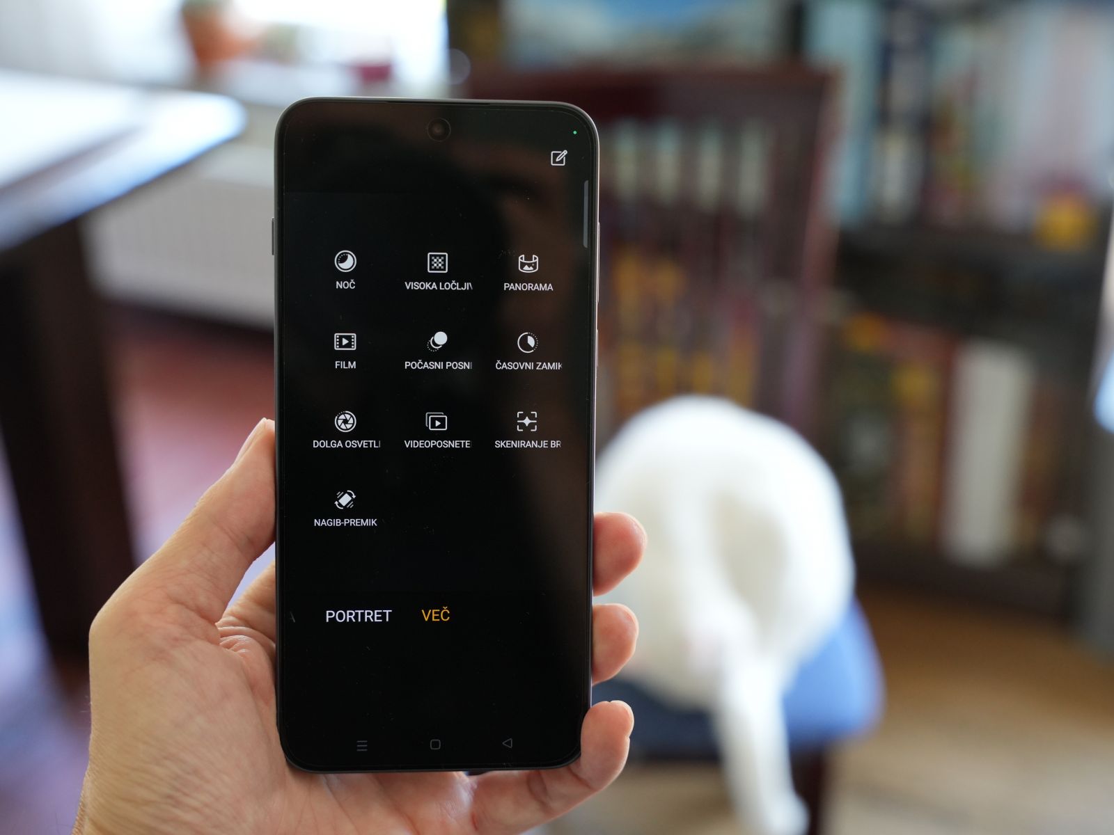 Portret omogoča prilagoditev stopnje zameglitve ozadja in uporabo lepotnega načina, medtem ko Pro način odpre ročne nastavitve, kot so ISO, hitrost zaklopa, temperatura beline, kompenzacija osvetlitve in ročno ostrenje. V meniju Več so zbrani dodatni načini, kot so Noč, Panorama, Time-lapse, Slow Motion in Dual-View Video.