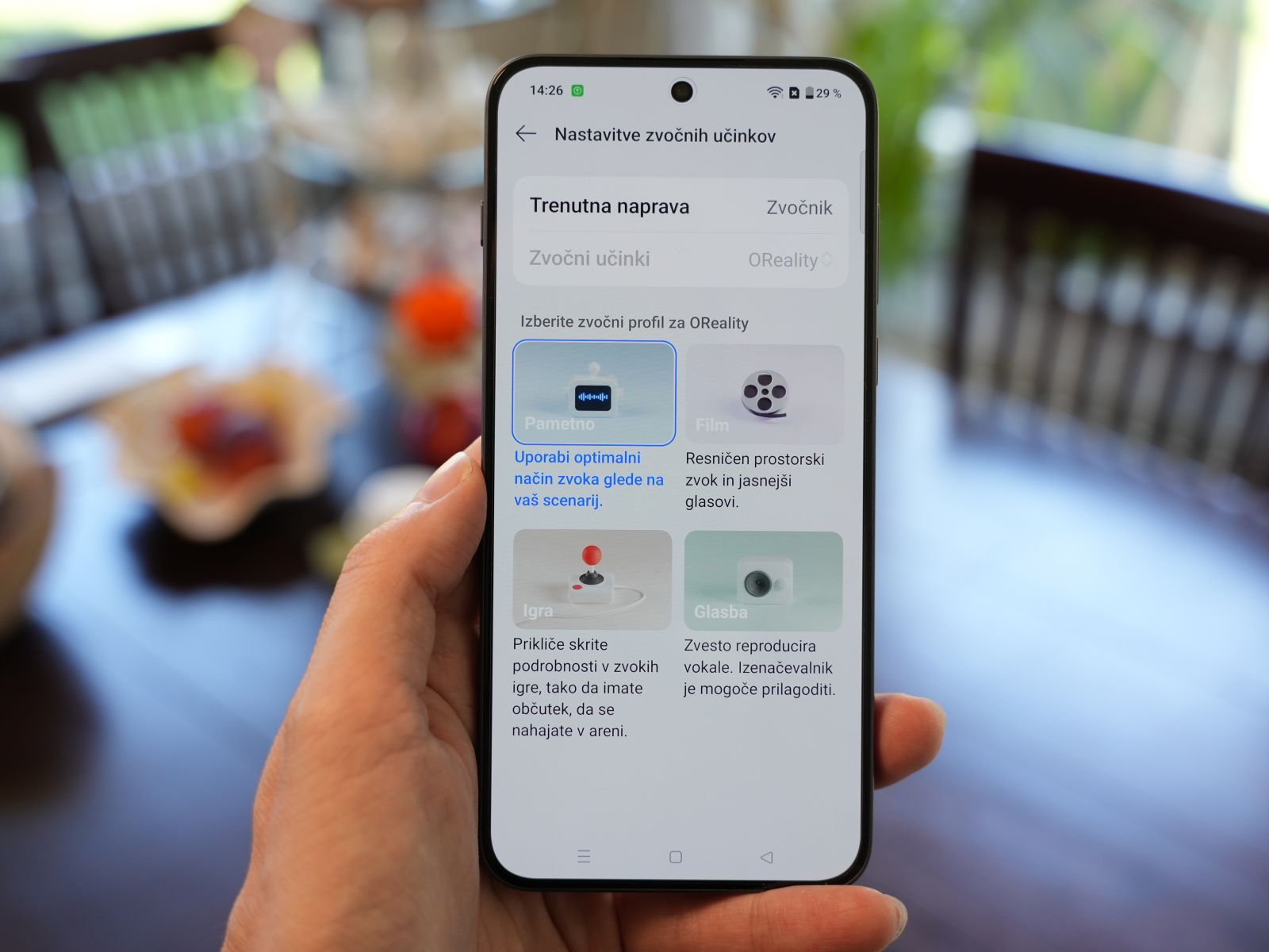 OnePlus Nord 5 uporablja klasično hibridno stereo postavitev zvočnikov, kjer zgornji zvočnik opravlja dvojno vlogo – kot slušalka in kot sekundarni kanal za stereo zvok. Glavni, močnejši zvočnik je na spodnjem robu, kar je pri tej konfiguraciji pričakovano. Kljub temu je stereo učinek opazen in dovolj dobro uravnotežen za vse scenarije.