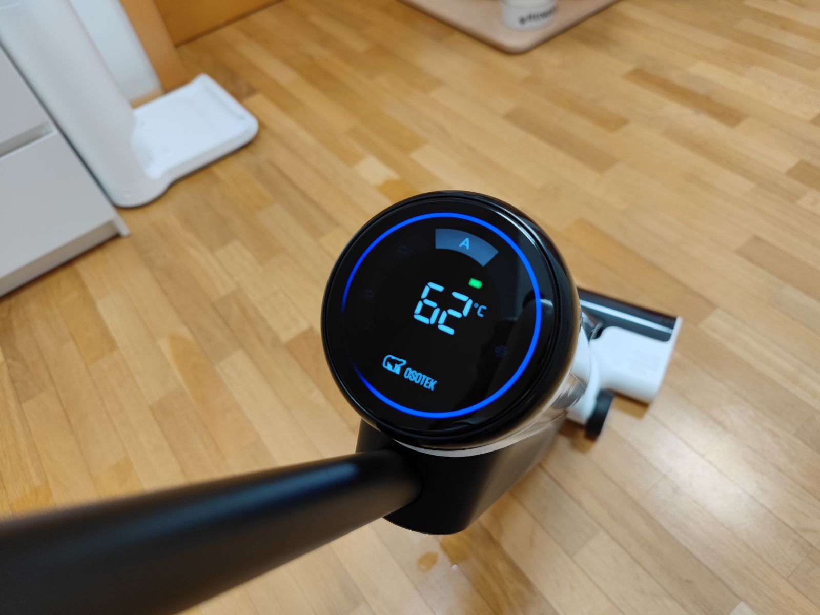 Osotek H100 Pro ima nameščen res velik, kontrasten, barvit in dobro čitljiv zaslon, na zaslonu pa lahko vsak trenutek, v realnem času odčitamo vse pomembne informacije. Okoli celotnega roba zaslona poteka barvni krogec, ki se obarva glede na moč delovanja. Malo nižje po levi strani imamo označen način delovanja, na drugi, desni strani opozorilo za baterijo, ko doseže spodnjo mejo in bo potrebno polnjenje, stanje baterije pa sicer vidimo tudi v grafični obliki s prikazom ikone baterije, kjer prikazuje polnost. Na sredini imamo na veliko označeno temperaturo vode v sesalniku, pod temperaturo pa je še prostor za dodatna obvestila (npr. prazna posodica z vodo).
