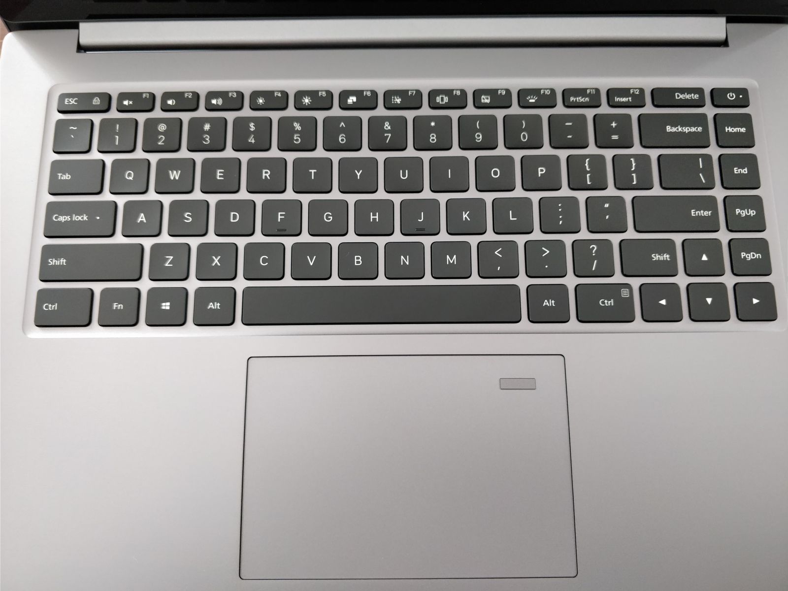 Kot marsikaj na Xiaomi Notebook Pro, tudi tipkovnica zelo spominja na izgled tipkovnic prenosnikov podjetja Apple, kar ni nujno slaba stvar. Tipkovnica je polne velikosti, kar manjka, je le ločen numerični del, ki pri modernih 15.6'' prenosnikih dandanes velikokrat izostane na račun polne velikosti ostalih tipk in kompaktne oblike prenosnika. Kvaliteta tipkovnice je izjemno visoka, tipke so tudi osvetljene, ni pa možnosti nastavitve nivoja osvetlitve, tipke lahko le osvetlimo ali ne. Občutek pri tipkanju je zelo dober, sprva mogoče nekoliko nenavaden, saj ima tipkovnica precej nizek vhod tipk (cca. 1.5mm) kar pa se hitro navadimo. Omeniti gre le še razporeditev znakov, gre za Standard US QWERTY dizajn, kar pomeni, da bomo za prilagoditev slovenski tipkovnici uporabili namenske SLO nalepke, ki jih lahko kupimo v vseh računalniških trgovinah za le nekaj €, le te pa so precej kvalitetne, obstojne in komaj opazne.