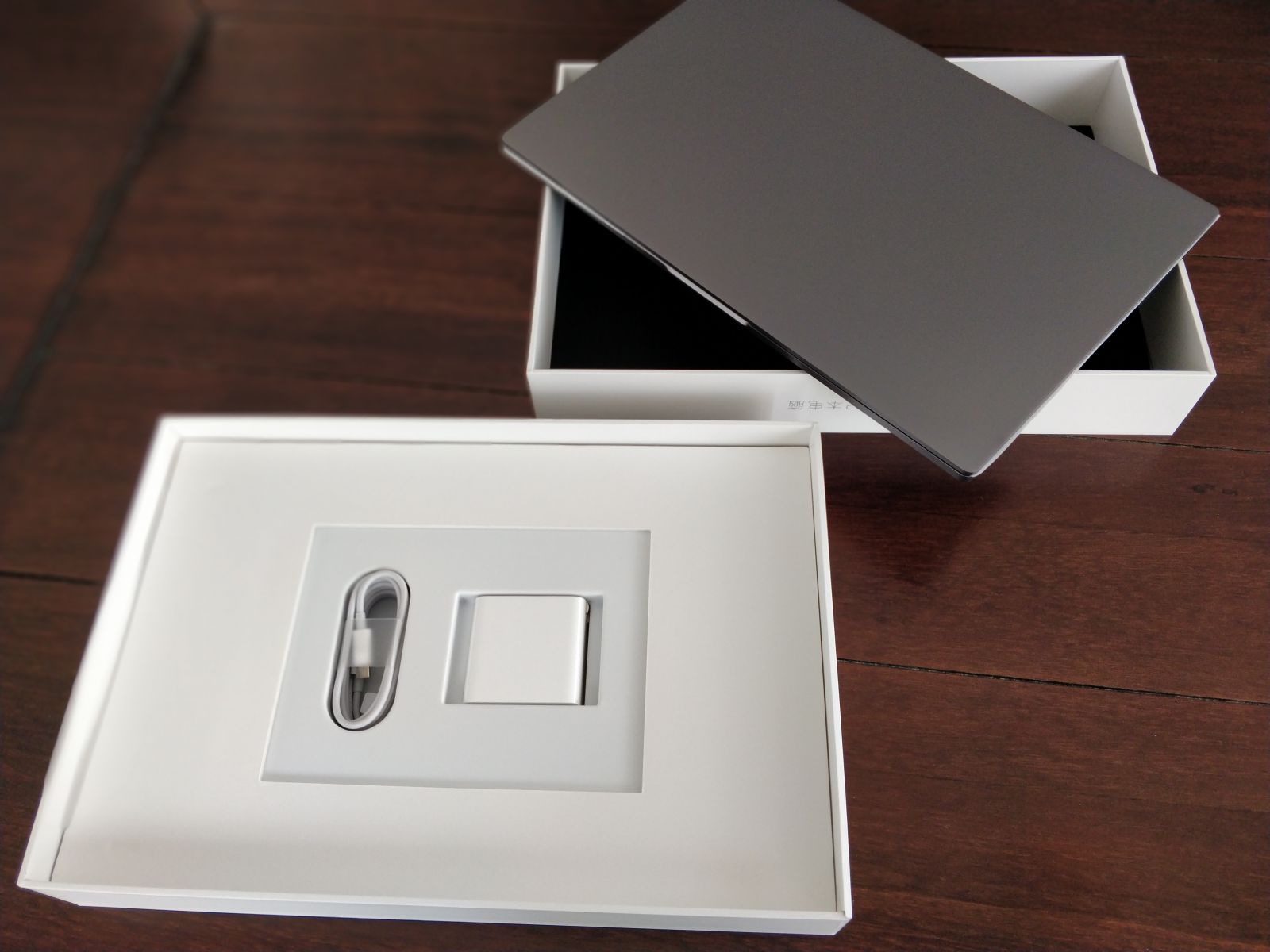V kvalitetni, iz trdnega kartona, minimalistično beli škatli, ki je na zgornji notranji strani obdana z zaščitno peno, poleg prenosnika prejmemo še USB-C kabel ter adapter oz. električni priključek. Priložena so tudi kratka navodila, ki pa so v kitajskem jeziku, a jih odkrito rečeno niti ne potrebujemo. Prvi vtis je zelo dober, od embalaže do napajalnika in kabla, ki delujeta zelo kvalitetno. Potrebujemo le še China-EU (lahko tudi kakšen univerzalni potovalni adapter za priklop na naše omrežje).