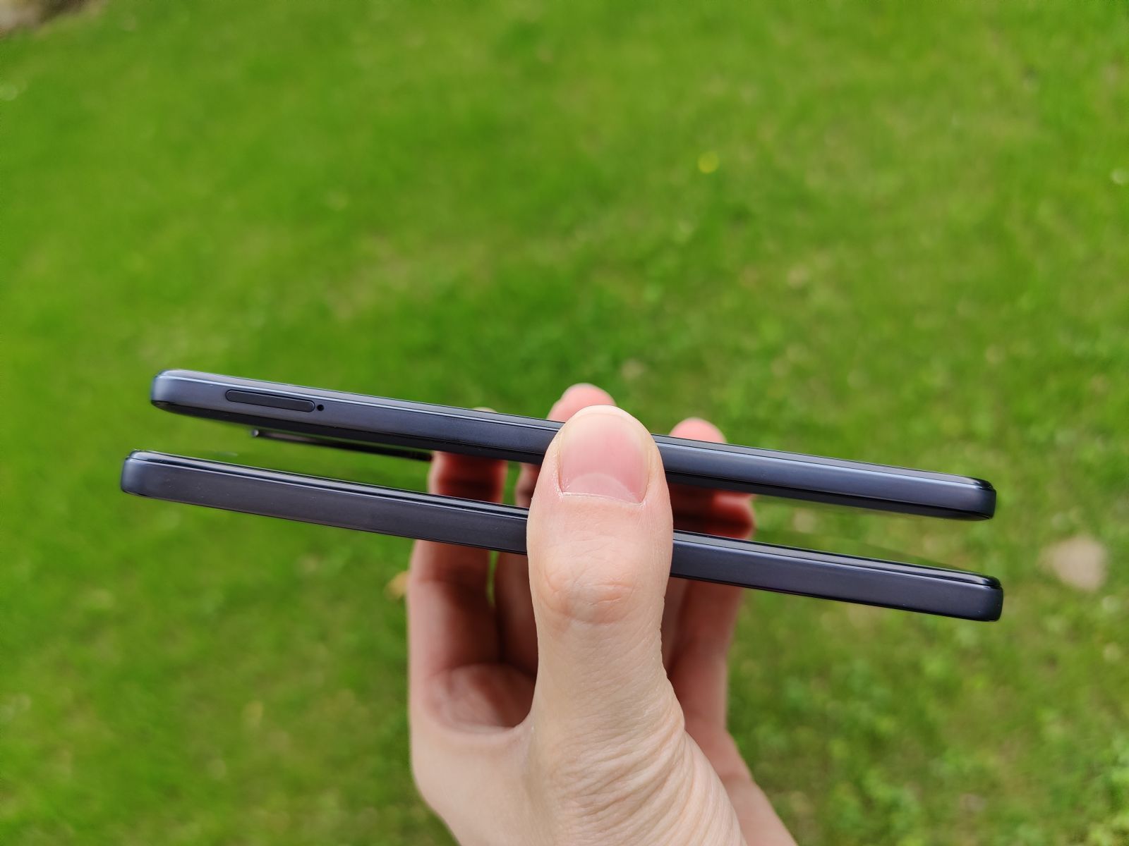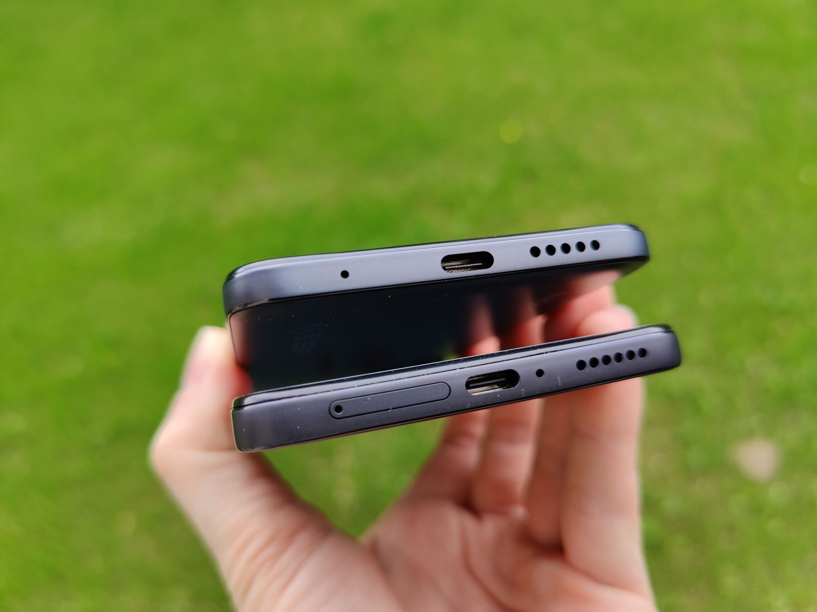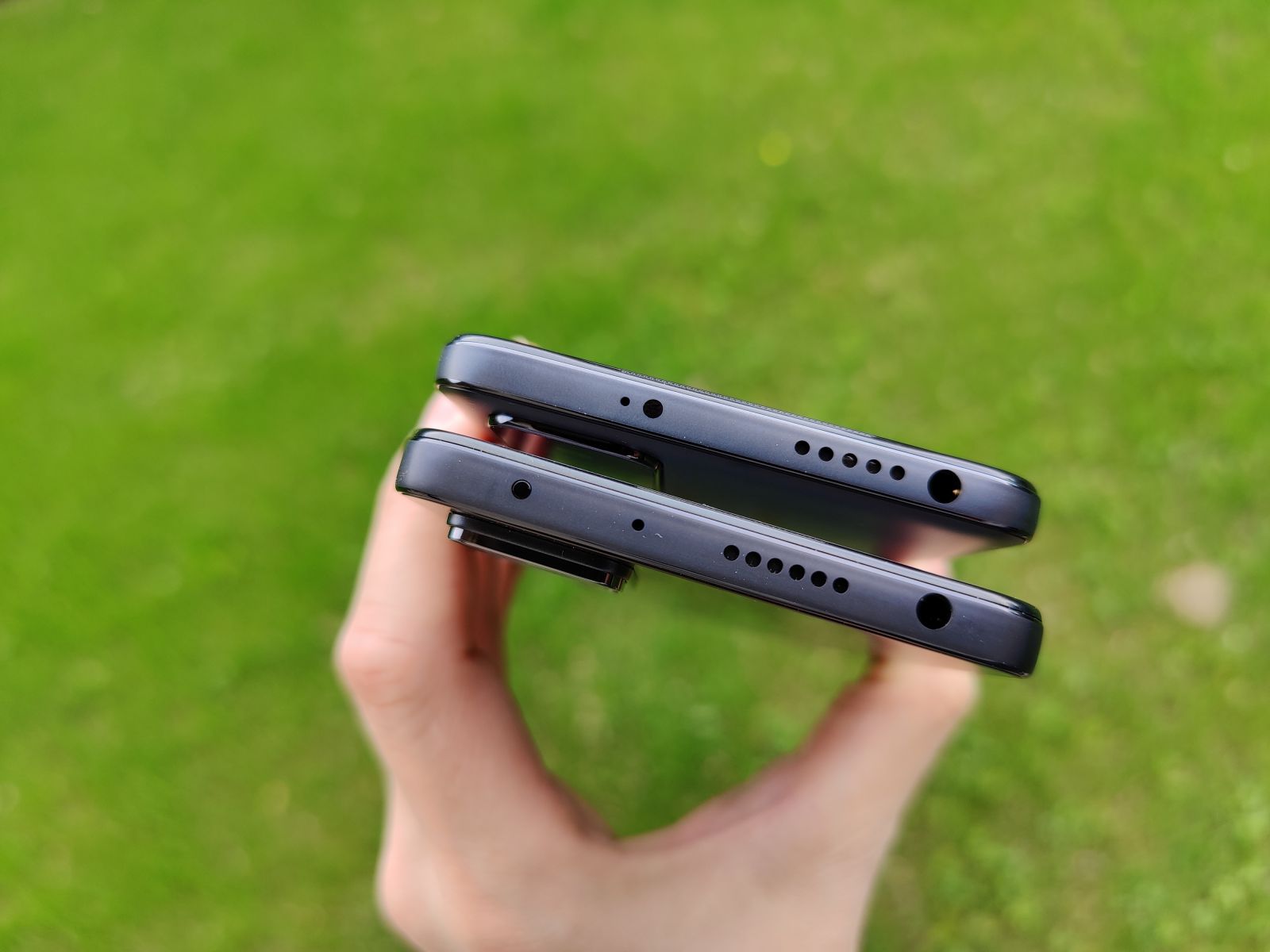 Opazne razlike se pričnejo na straneh telefonov, Pro model ima režo za SIM/SD na spodnji strani telefona, navadni Note 11 pa na levi stranici. Vse ostalo na obeh modelih praktično enako, zvočnika na spodnji strani kjer je tudi mikrofon in USB priključek. Na desni strani pa tipka zavklop/izklop in istočasno bralnik prstnih odtisov, nad njim pa tipka za glasnost. Tudi zgornja stranica podobno z nameščenim zvočnikom, 3.5mm vhodom, IR ter sekundarnim mikrofonom. Zadnja stran telefonov sicer skoraj identično pri sistemu kamer (le da ima navadni Note dodatno globinsko kamero, Pro pa na tem mestu oznako AI) sicer pa razlika na račun zaobljenosti, Pro model s povsem ravno zadnjo stranico, navadni model pa z rahlo zaobljeno. Z zadnje strani oba delujeta všečno, Pro model nekoliko bolj premium.