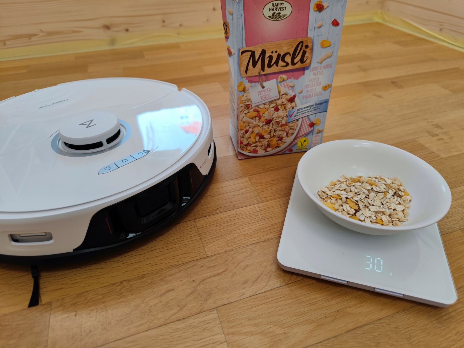Za omenjeni test smo uporabili muesli z različnimi dodatki, zrna različnih mer in teže. 30 gramov naključno izbranih zrnc smo potresli po ročno izdelanem poligonu (okvirju iz lesa). Tako je bil test enakovreden za vse modele. Čistili smo tako na gladki podlagi (lakirani parket), kot tudi na gosto tkani, nizki preprogi, kjer je muesli zamenjal riž (20 gramov).