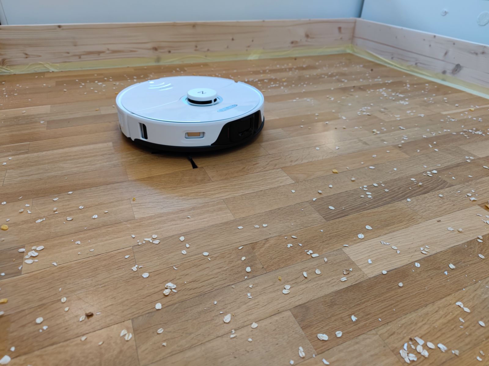 Za oceno učinkovitosti mokrega čiščenja smo pripravili zmes vode in polnozrnate moke, zmes dobro nanesli po tleh ter tla dobro posušili. Robotski sesalniki sicer niso namenjeni tovrstnemu čiščenju, saj za trdovratne, zasušene madeže potrebujemo močno brisanje, a tudi zato je tovrstni test dober pokazatelj, kaj zmore posamezni sesalnik.