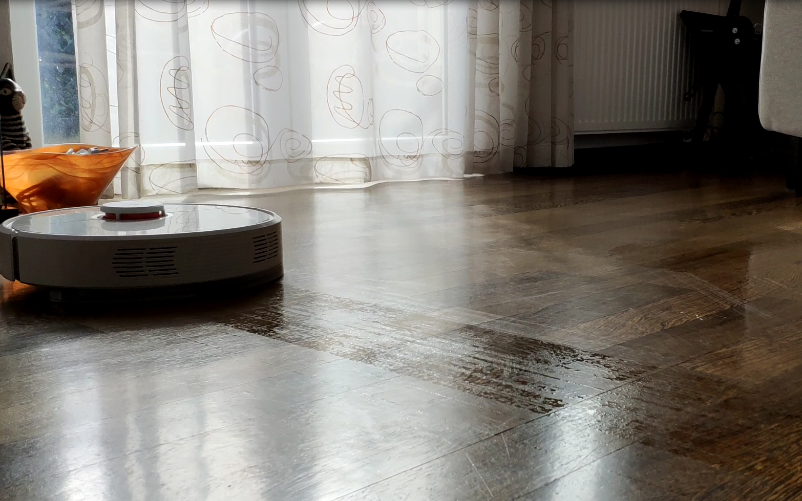Da ne bo pomote, Roborock S6 nikakor ne bo nadomestil ročnega drgnjenja umazanih tal, saj tekočine ni veliko, poleg tega pa navlaženo krpico le vleče po tleh, brez dodatnega vrtenja ali pritiska. Če imamo zelo umazana, zamaščena tla s kakšnimi trdovratnimi zasušenimi madeži bomo vsekakor morali »na kolena« in težavo odpraviti na staromoden način. A ko so tla kolikor toliko čista, ter spustimo sesalnik s polno posodo vode po naših prostorih, bo le ta še dodatno navlažil in očistil naša tla. Sledovi navlaženih tal so vidni cca. minuto, preden se osušijo. Sam sem se navadil, da ga v akcijo pošljem 3x tedensko, vedno s posodico vode in sem nad rezultatom navdušen, v hiši že kar nekaj časa nismo ročno pomivali tal npr. Sam dodam na krpico še nekaj kapljic čistila (v posodico ni priporočljivo), da po čiščenju še malo zadiši, kakšen procent pa pripomore tudi k še bolj učinkovitem čiščenju. Čeprav ne drgne tal, pa je videz in občutek svežine na mokro obrisanih tal res dober.