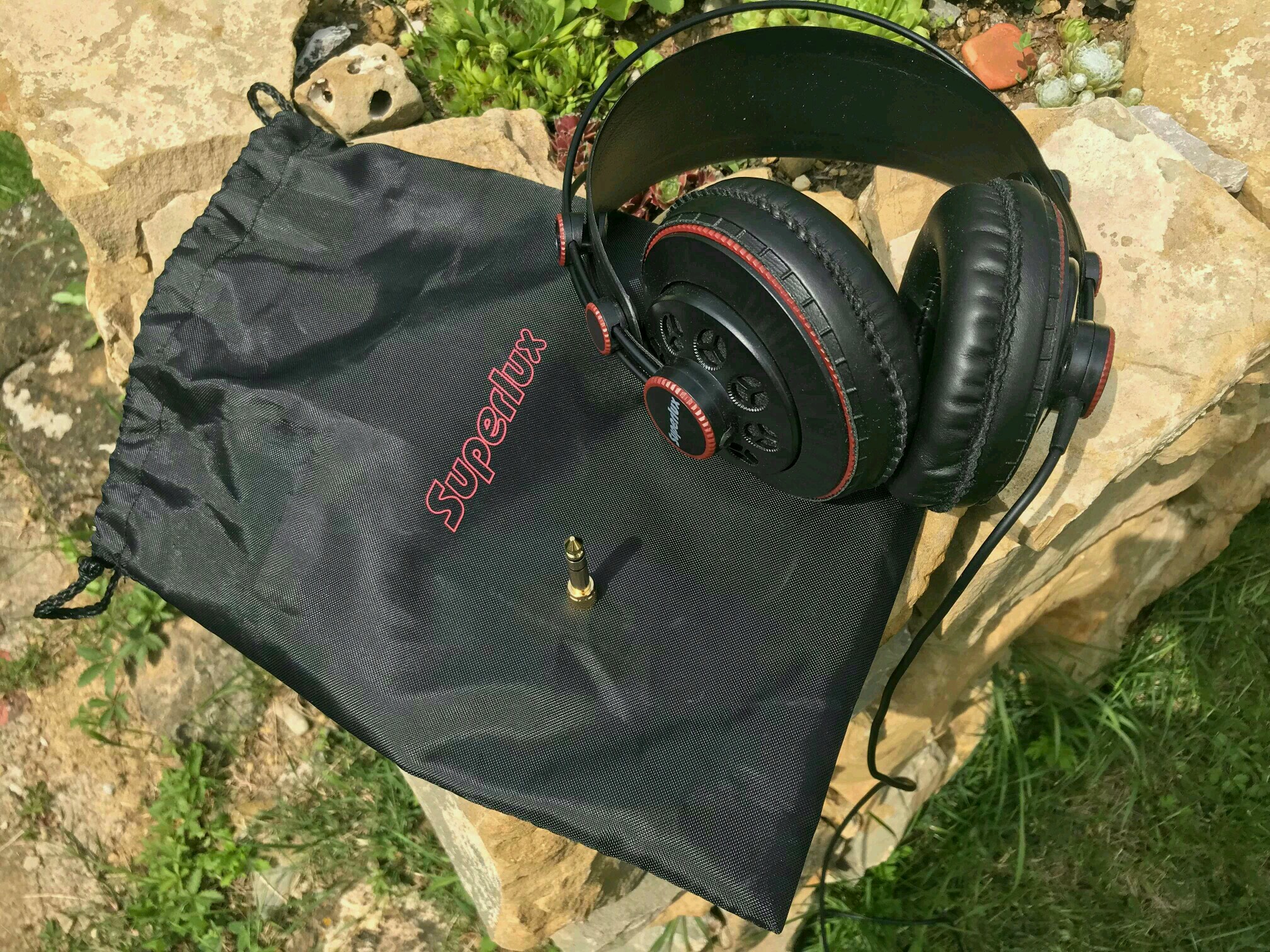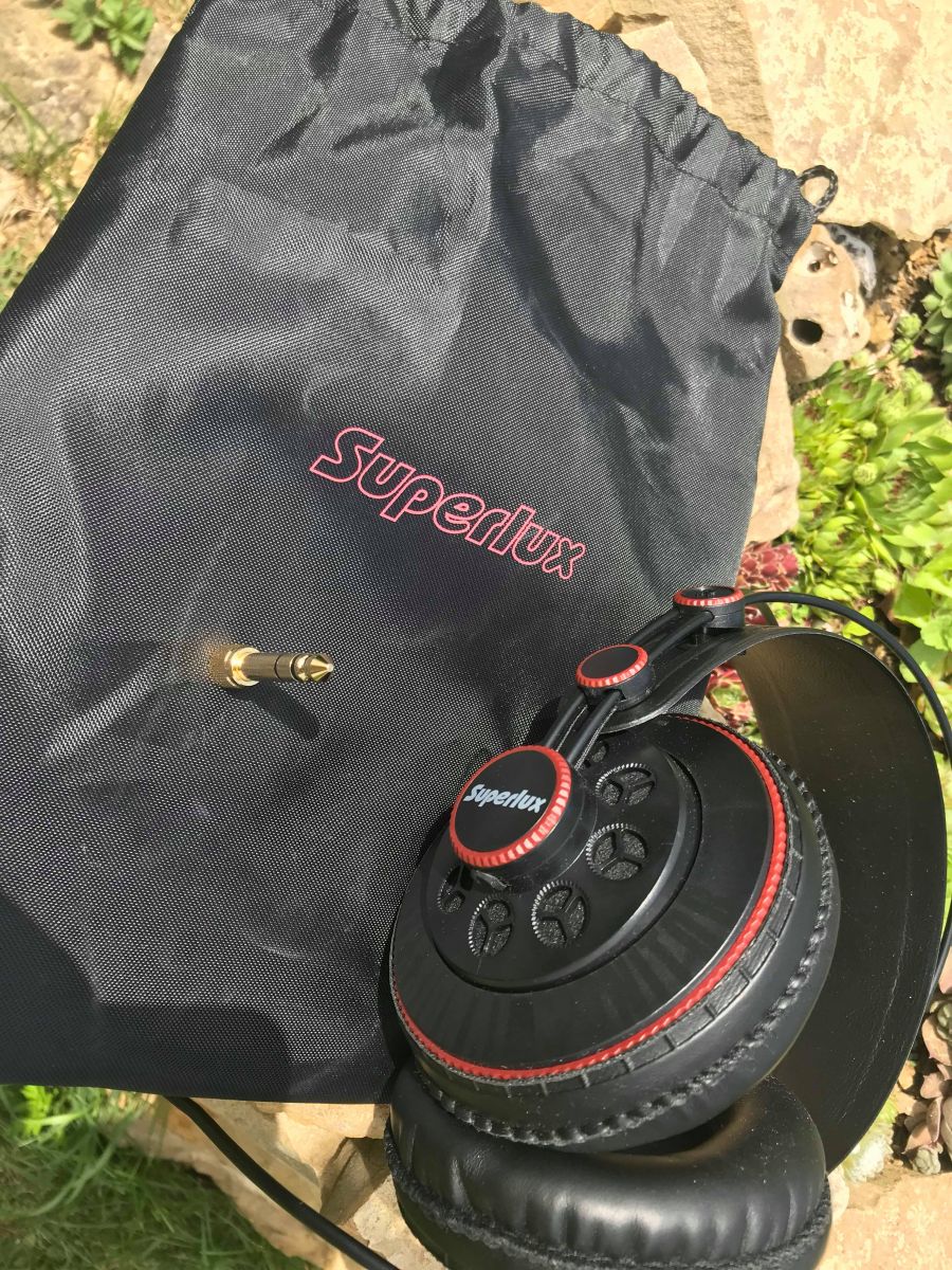 Slušalke so povsem preprosto zapakirane v kartonski okvir ter obdane s folijo. Kljub zelo ugodni ceni slušalk pa je Superlux v paketu priložil še zelo kvalitetno in privlačno torbico za prenašanje slušalk. V paketu pa je priložen tudi ¼” oz. 6.3mm adapter (stereo priključek).