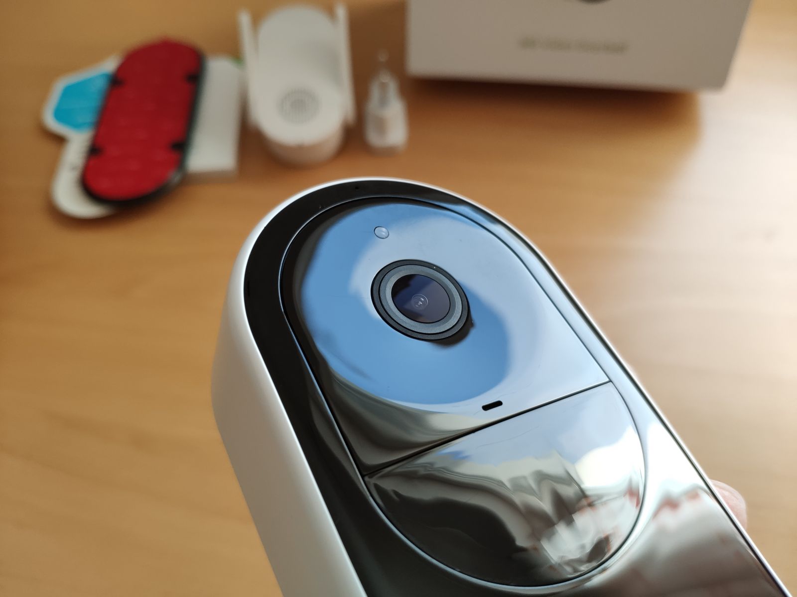 Namestitev zvonca je potekala hitro in enostavno, pri montaži imamo dve opciji, pritrditev z vijaki ali z dvoslojnim lepilnim trakom. Ker smo zvonec namestili na gladka vrata smo uporabili kar lepilni trak, ki precej lahek zvonec drži izjemno dobro, ni nobene potrebe po vijakih pri gladkih površinah. Priporočena namestitev je pri višini 1.4m.