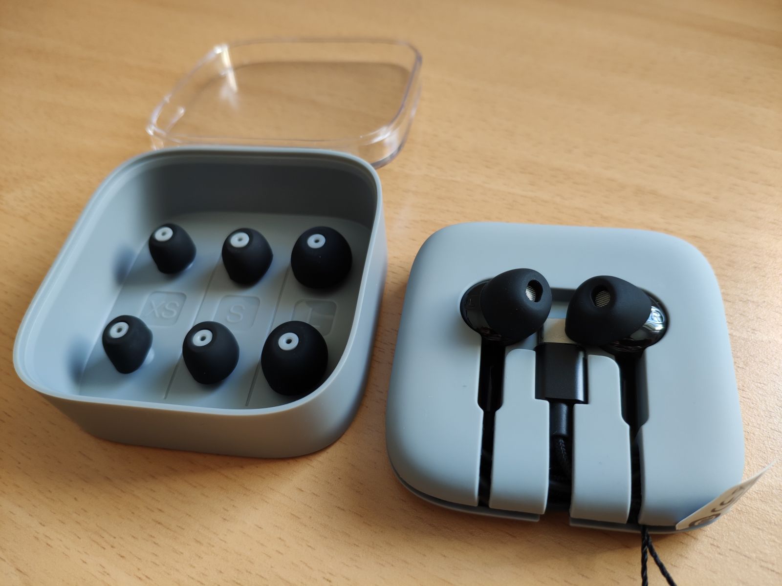 Priložena trdna škatlica in mehka torbica sta lep plus, trije dodatni nastavki različne velikosti pa poskrbijo za dobro prilagodljivost vsakemu učesu.