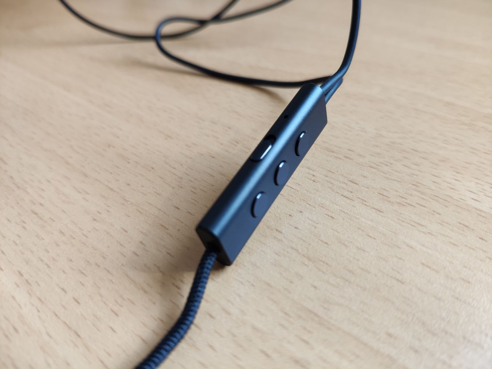 Kabel je delno pleten in na koncu delno iz prijetno mehke gume. Del od priključka USB Tip-C, do modula ANC je pleten, preostanek kabla pa iz gume. Modul za aktivno dušenje hrupa vsebuje kontrole s tremi gumbi, ki omogočajo nadzor nad glasnostjo, predvajaj/ustavi/preskoči skladbo in možnostjo, da se javite ali prekinete klic. Na gumijastem delu kabla najdemo majhen cilindričen mikrofon. Vsi deli omenjeni zgoraj, so izdelani iz kovine, z lepim, kvalitetnim zaključkom.