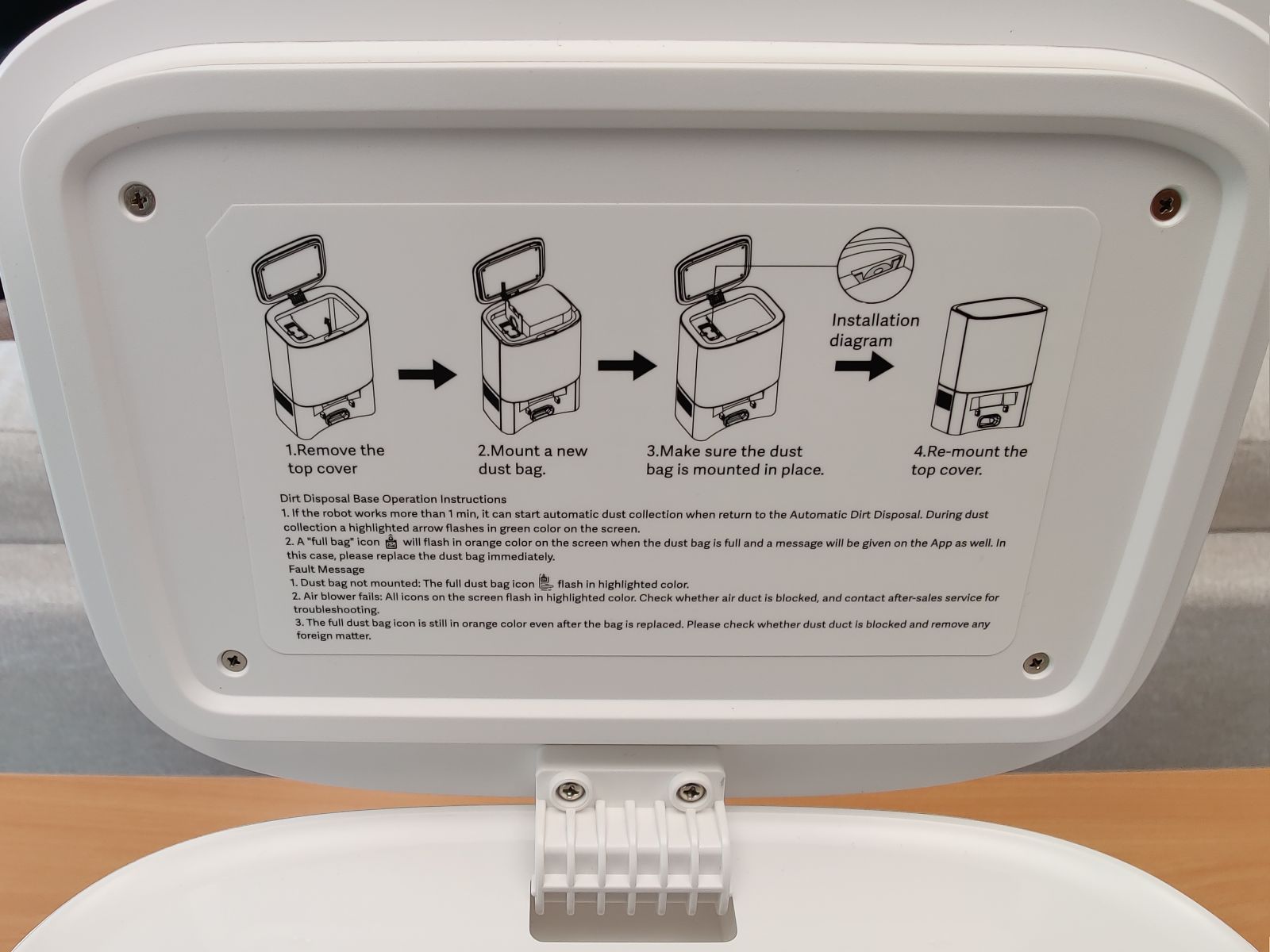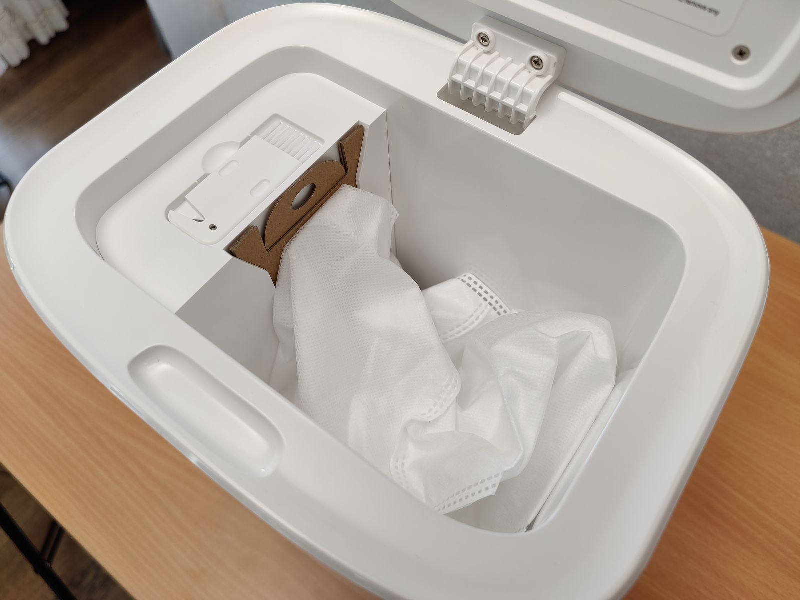 V polnilni postaji je nameščena 3L vrečka za smeti, po podobnem principu kot v el.sesalnikih in bo zadoščala za 1-2 mesece čiščenja posodice za smeti v sesalniku. Po vsakem opravljenem čiščenju se bo takoj po vrnitvi robotskega sesalnika na postajo samodejno pričelo čiščenje posodice, ki traja cca. 15 sekund. Postaja ima vgrajen močan 950W motor, ki pod visokim vakumom res precej temeljito in učinkovito izprazni posodico za smeti. Po nekajtedenski uporabi, ko je 3L vrečo potrebno zamenjati, enostavno s potegom najprej zapremo odprtino, da ne uhajajo smeti, nato pa vrečo enostavno odstranimo in zavržemo, namestimo novo in že smo za naslednjih 6-8 tednov pripravljeni na samodejno čiščenje posodice za smeti.