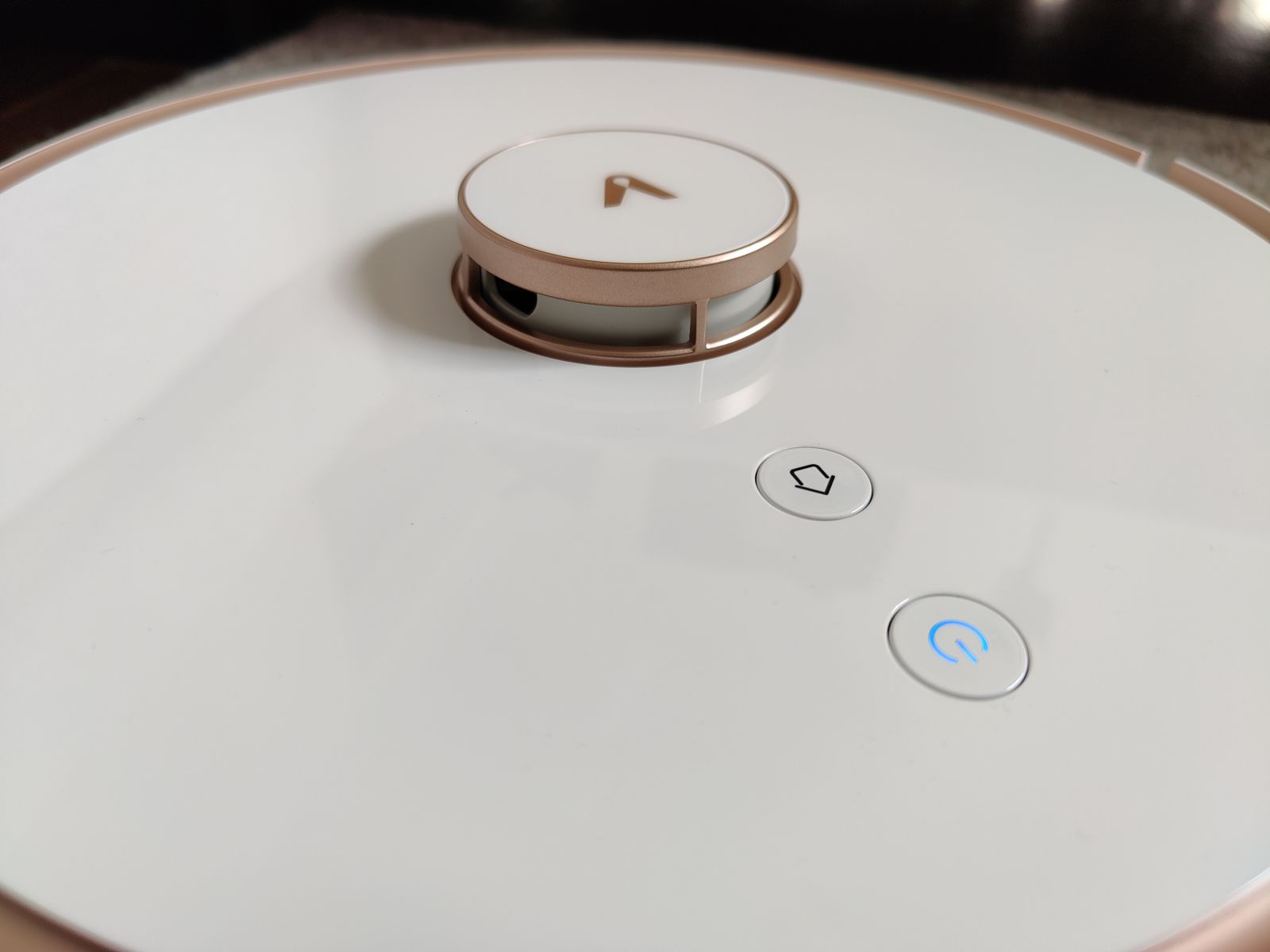 Že Viomi V3 je bil v primerjavi s predhodnikom bistveno elegantneje zasnovan v sijaj črni barvi, a tudi bela barva z zlatimi obrobami deluje pri novemu S9 modelu še zelo elegantno, še manj manj "plastično" od svojega predhodnika, s finimi, čistimi linijami in res kvalitetnimi materiali. Funkcijsko je gornji del sesalnika še vedno precej minimalistično zasnovan, na vrhu sesalnika je klasičen vrtljiv 360° laserski radar ter tokrat dva manjša okrogla gumba, preko katerega sesalnik vklopimo/izklopimo ali pošljemo čistit.